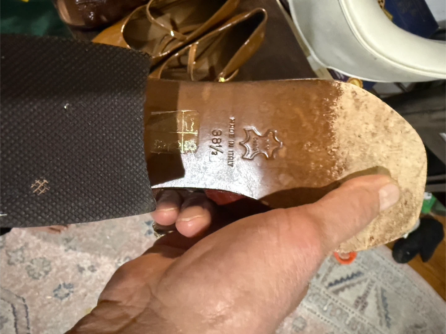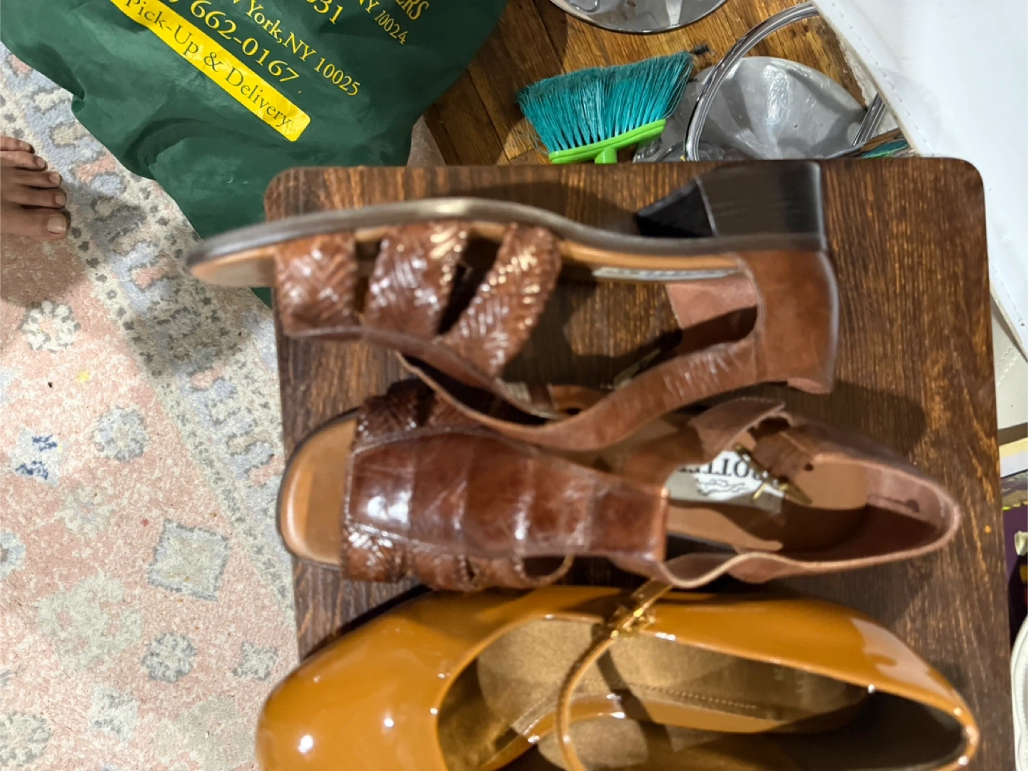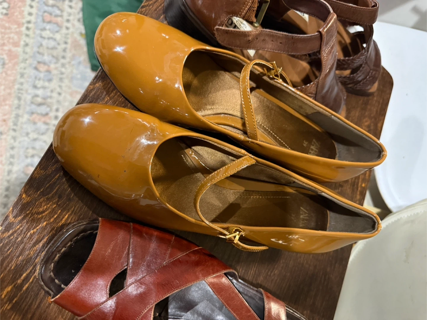 A pair of brown leather Trotters sandals and a pair of tan patent leather Zara Mary Jane style shoes. The Trotters sandals have a braided design. The Zara shoes are a size 39.