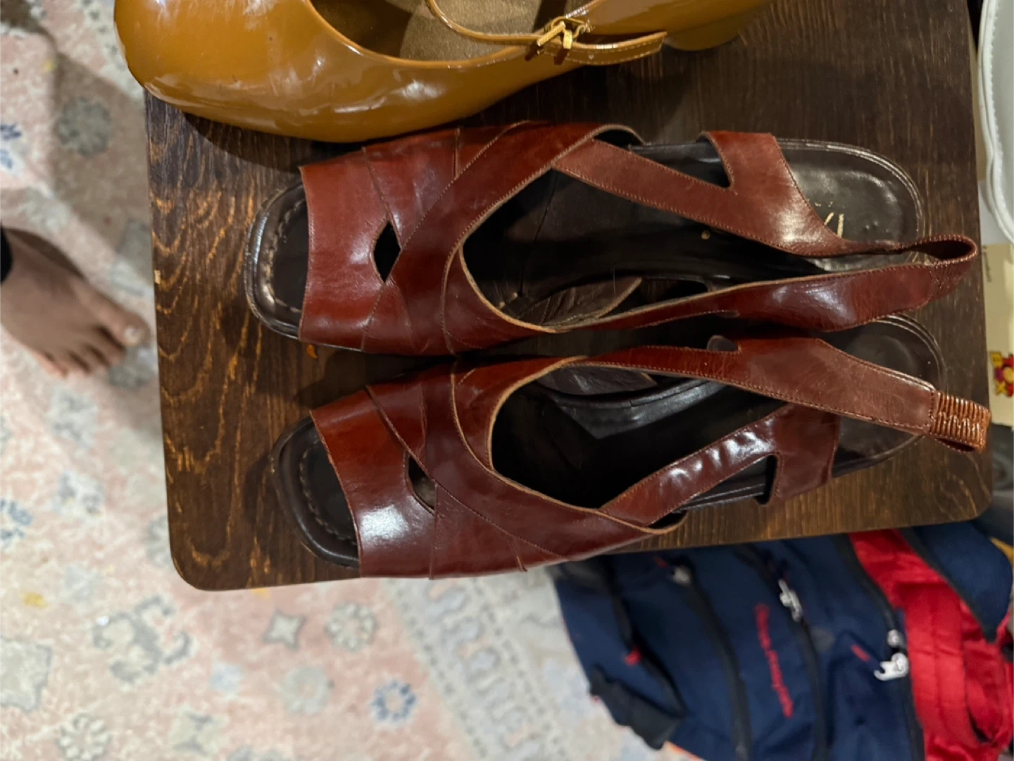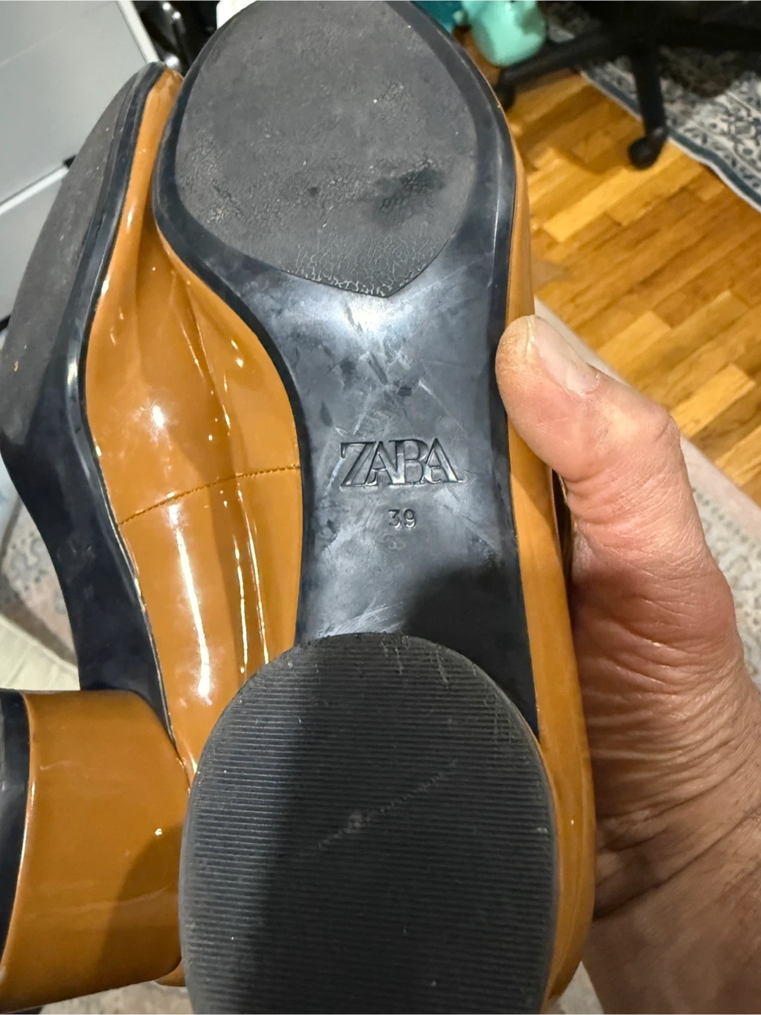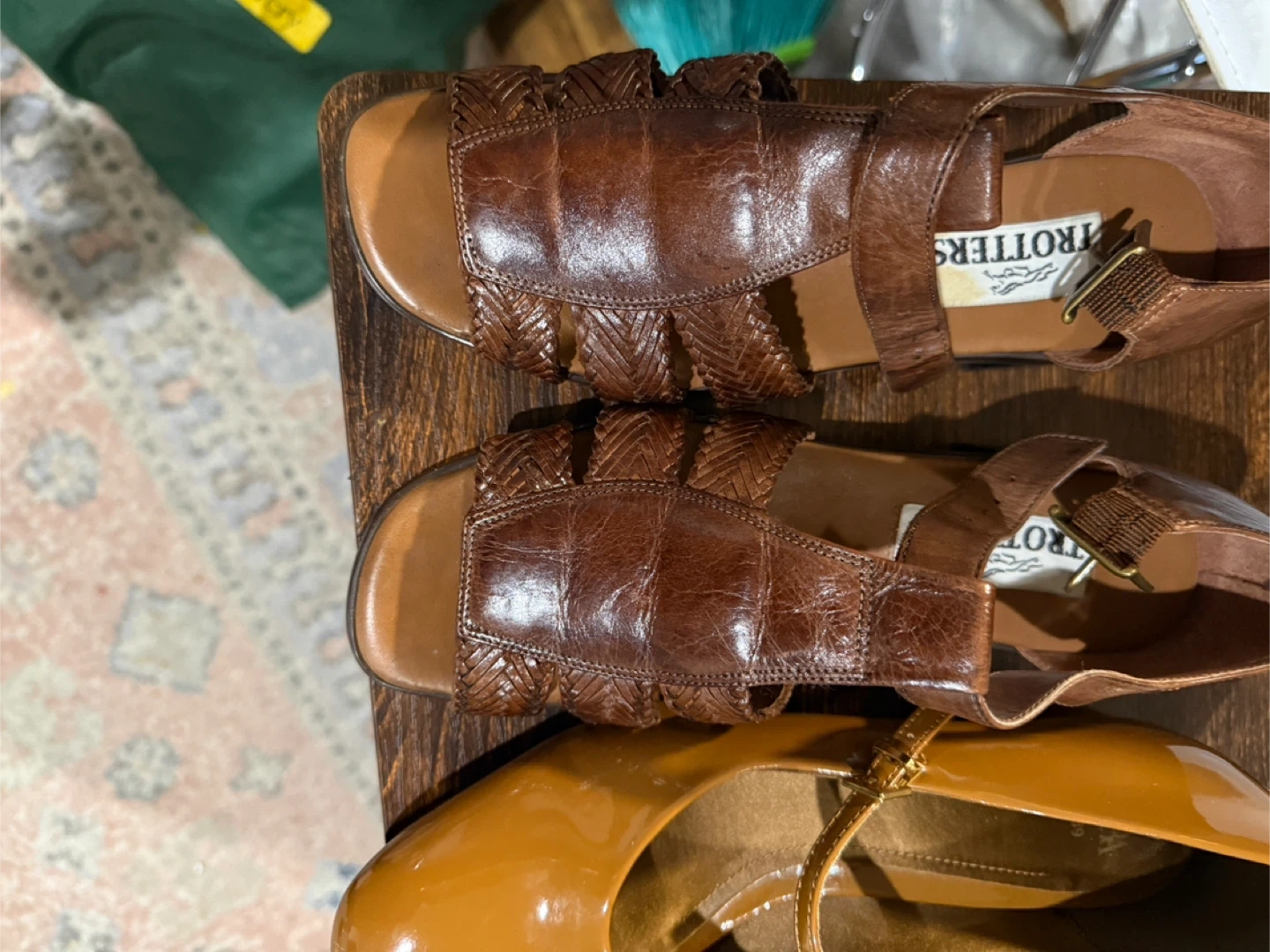 A pair of brown leather Trotters sandals and a pair of tan patent leather Zara Mary Jane style shoes. The Trotters sandals have a braided design. The Zara shoes are a size 39.