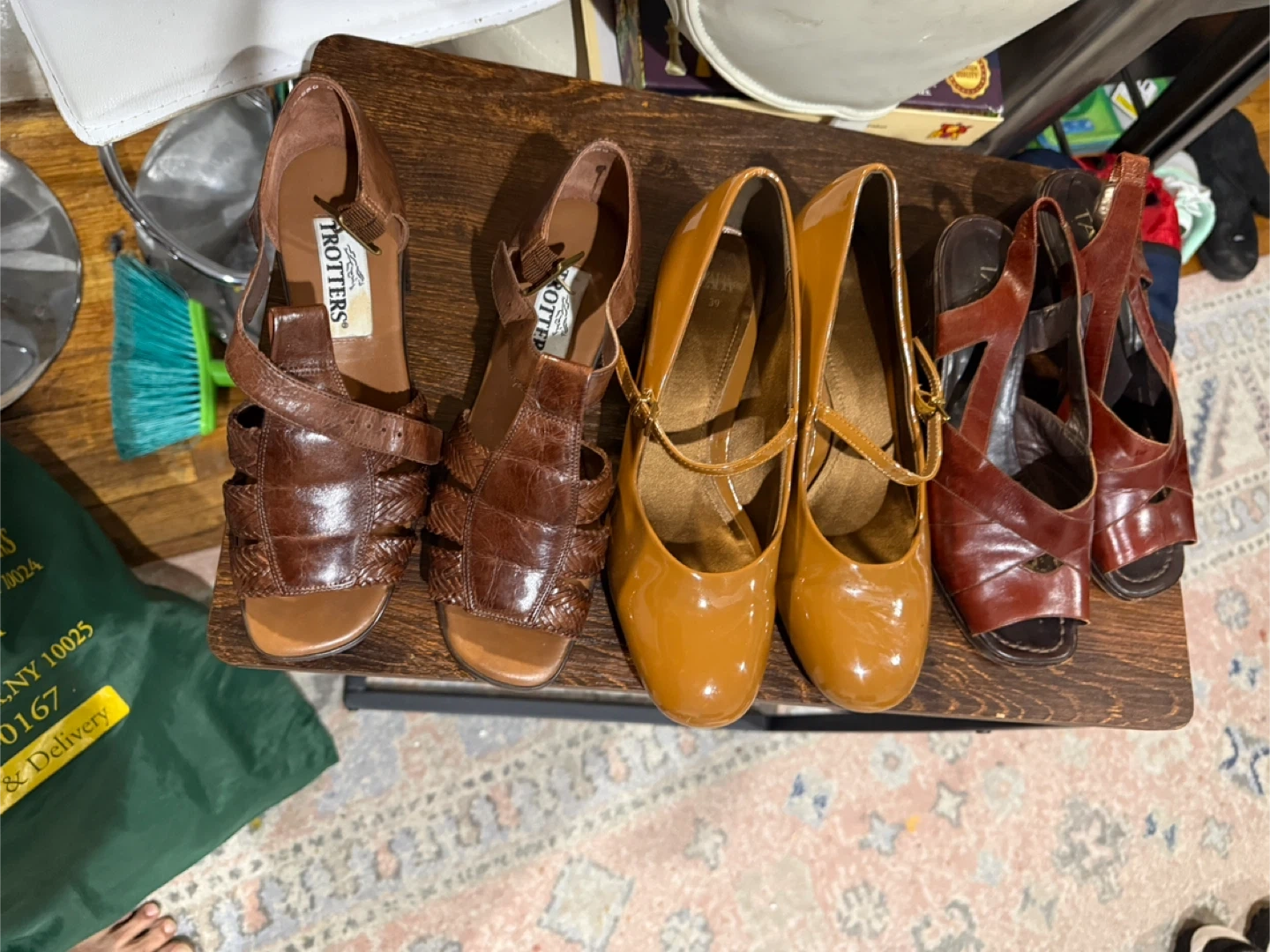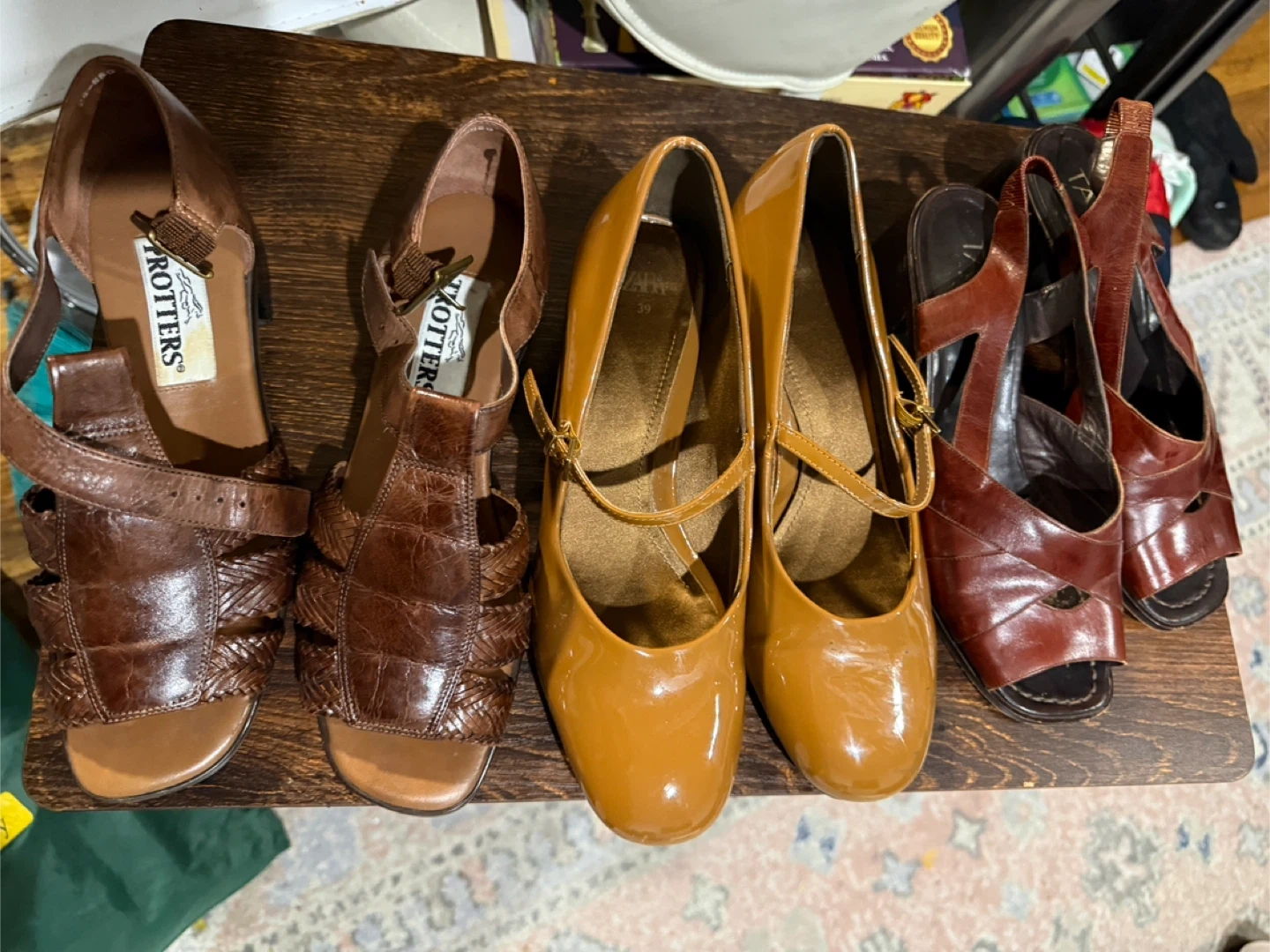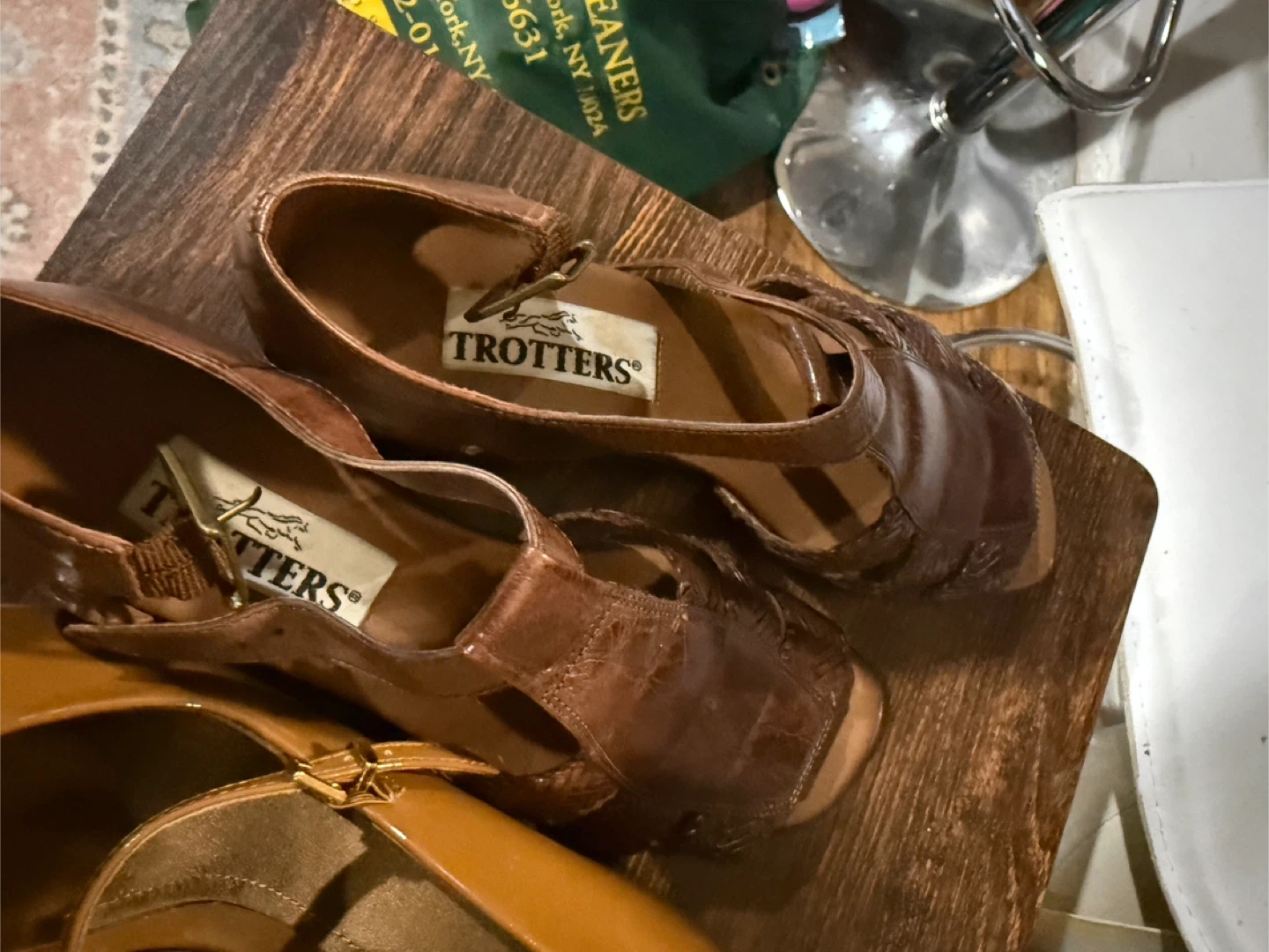 A pair of brown leather Trotters sandals and a pair of tan patent leather Zara Mary Jane style shoes. The Trotters sandals have a braided design. The Zara shoes are a size 39.