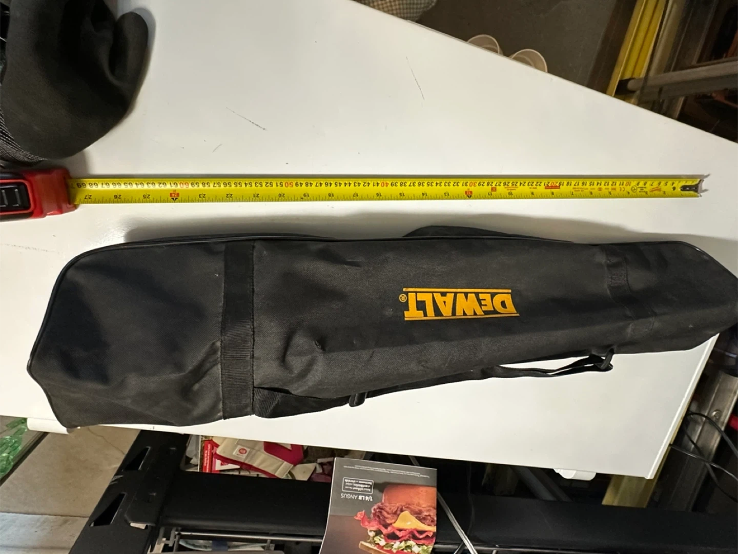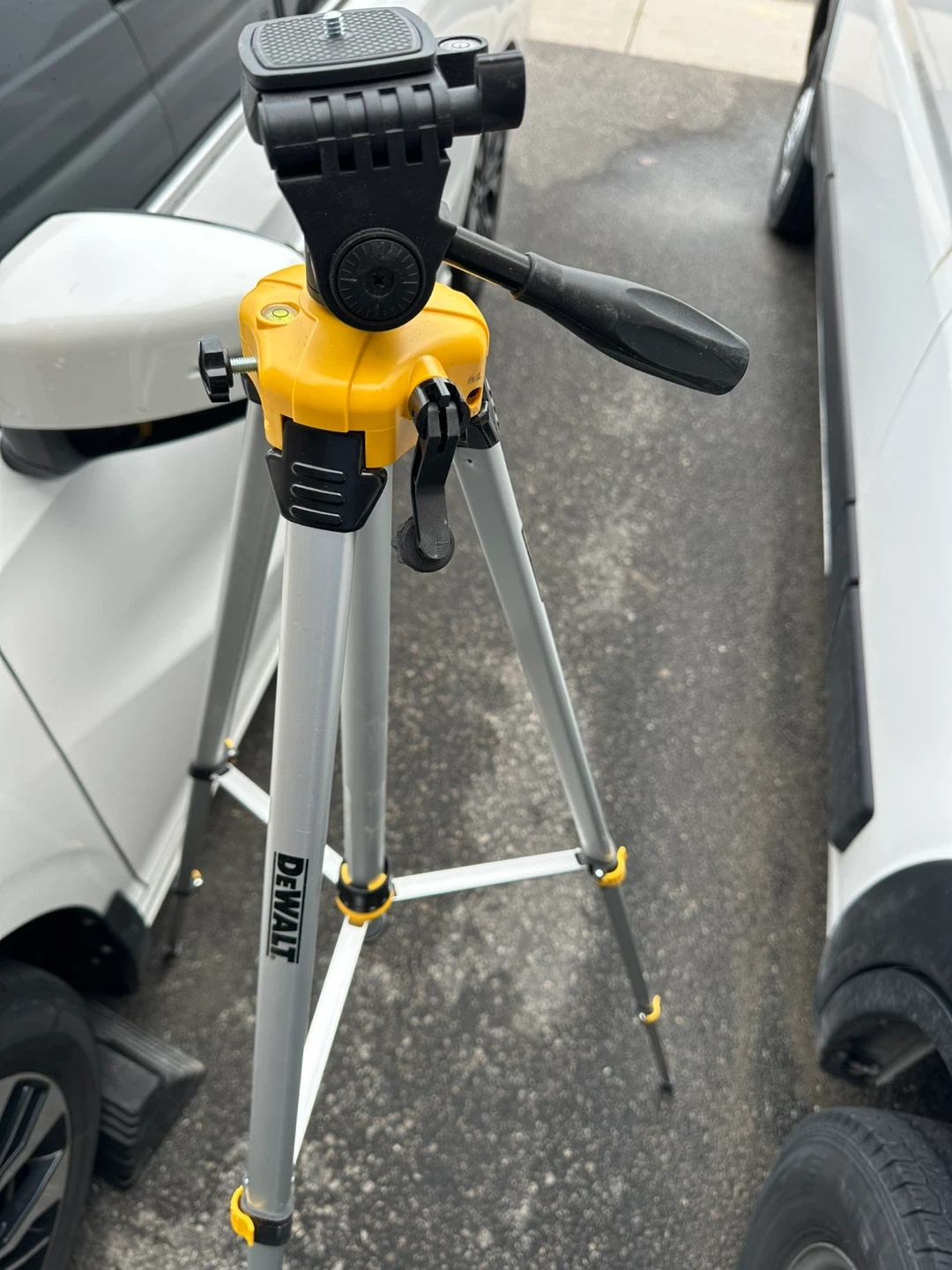 This is a DEWALT DW0881T adjustable and portable laser level tripod with a tilting head. It's made with aluminum construction and has non-skid feet. Collapsible legs for easy storage and transport. Includes a carrying pouch.