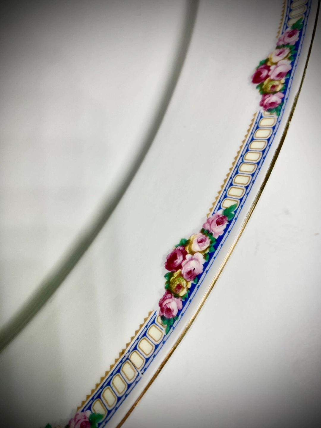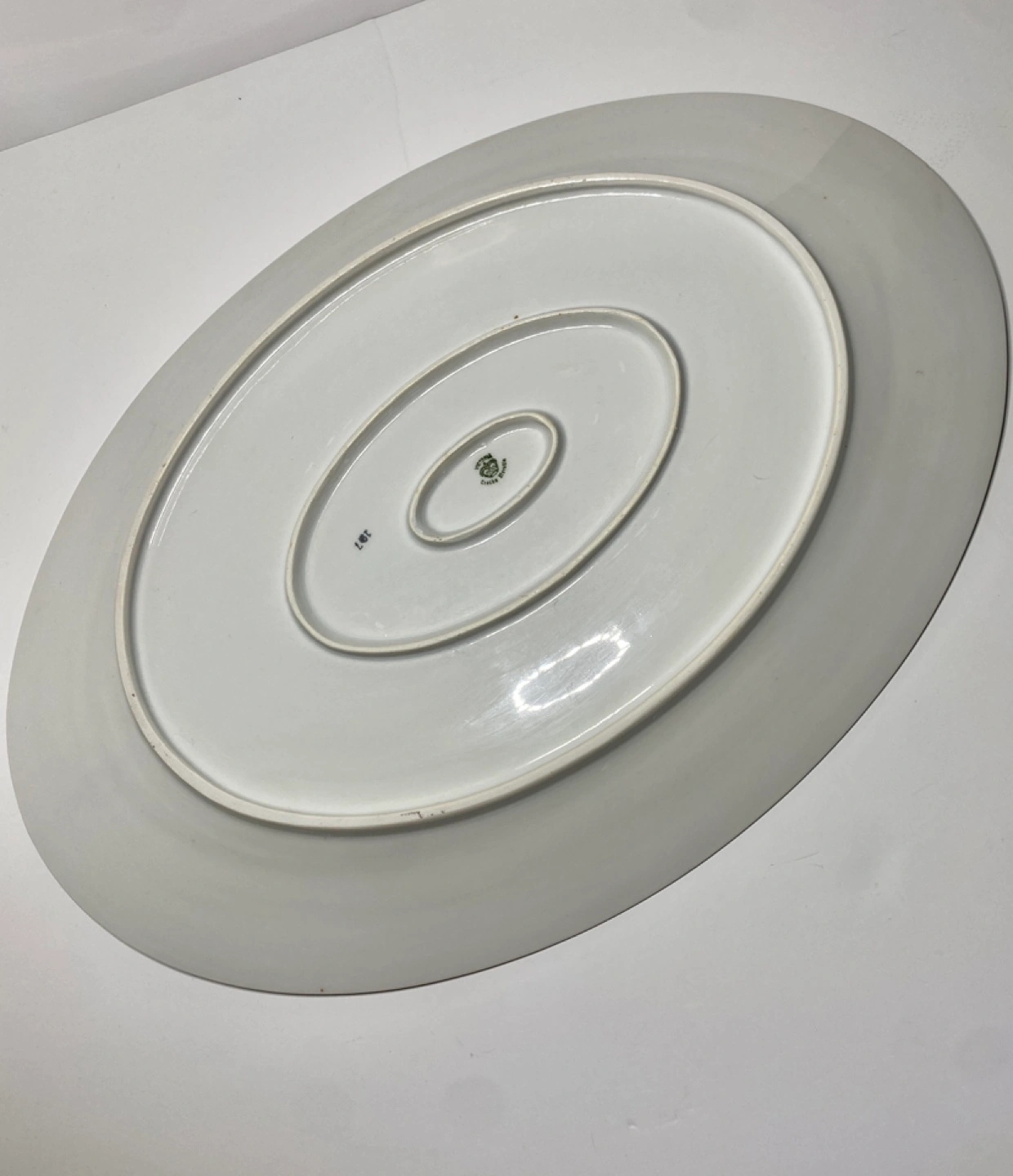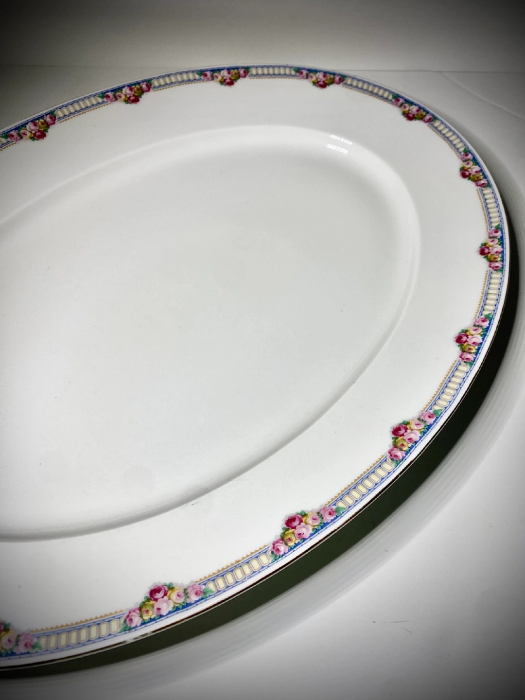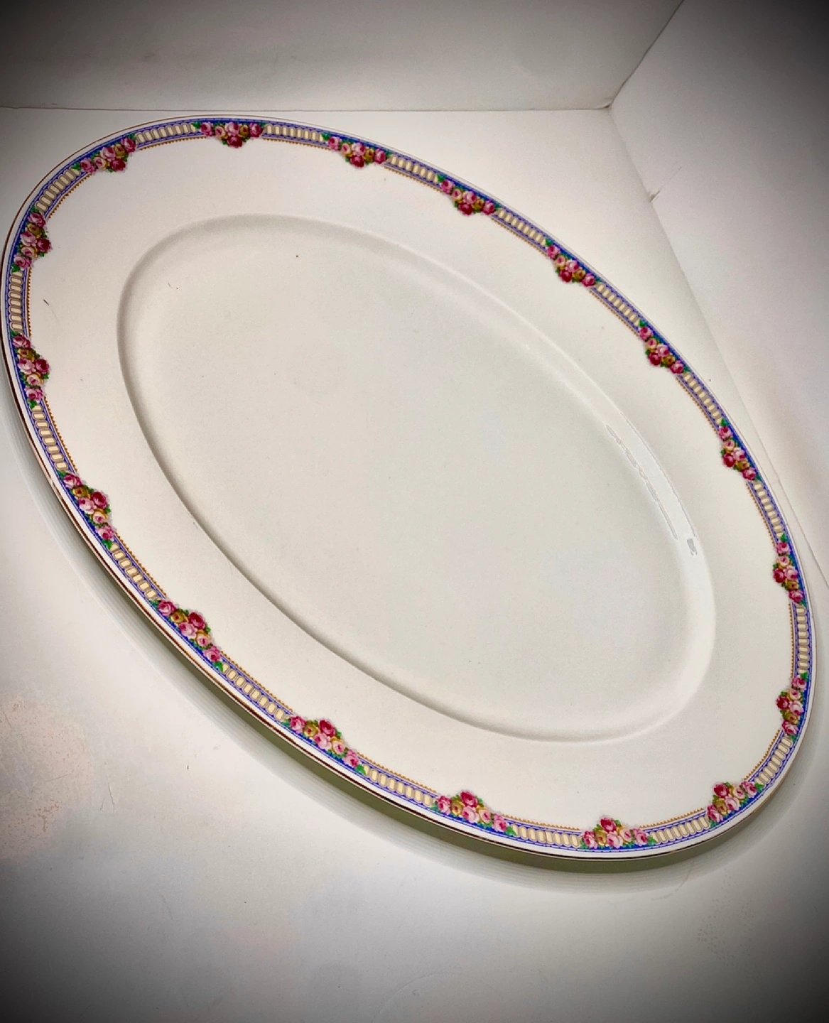 Large oval serving platter. White porcelain. Gold trim. Floral border. Roses and other flowers. Blue and gold accents. Beautiful vintage piece. Date range:
