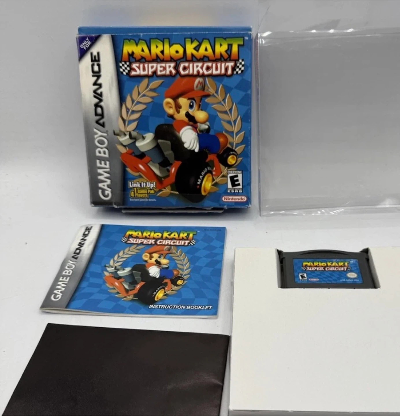 This is the Mario Kart Super Circuit game for Game Boy Advance. It includes the game cartridge, instruction booklet, and original box.