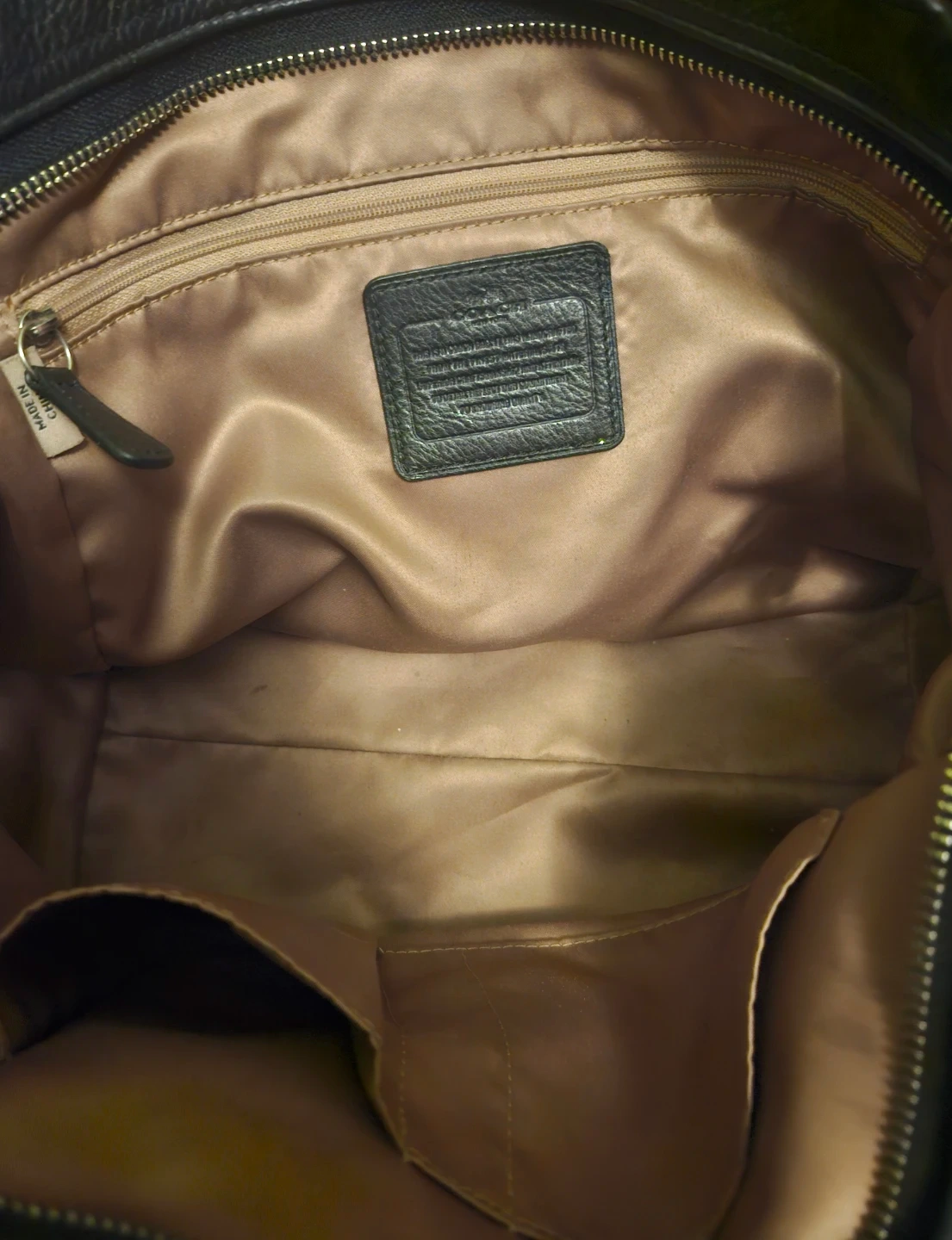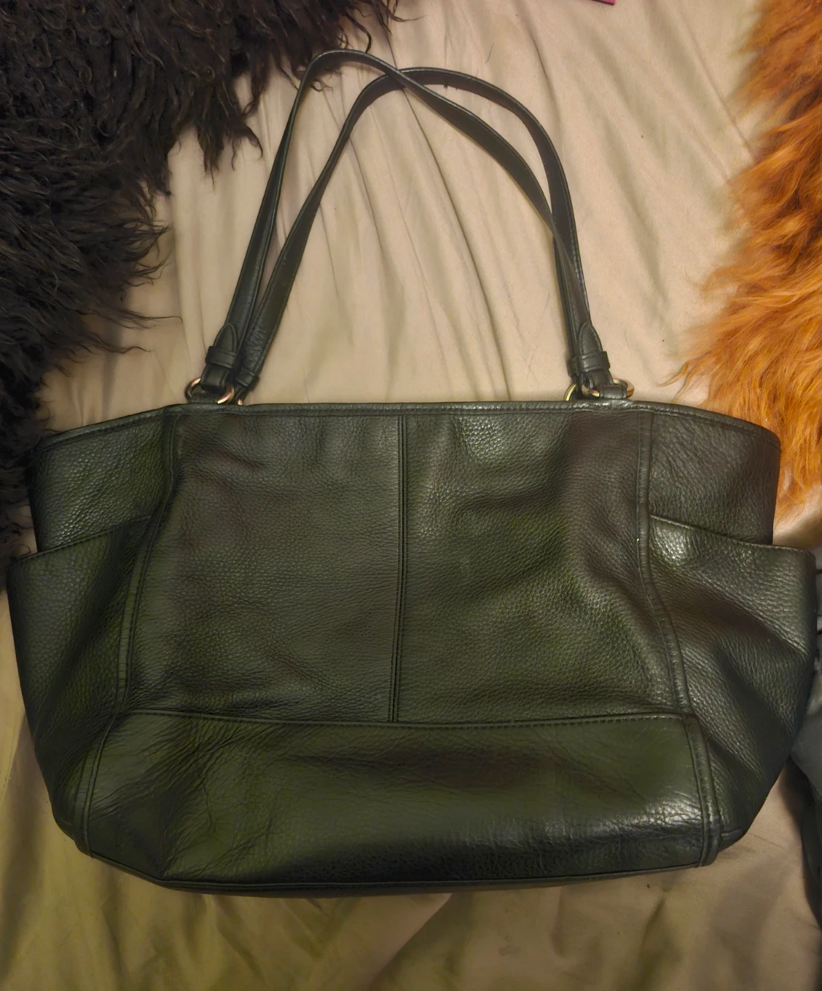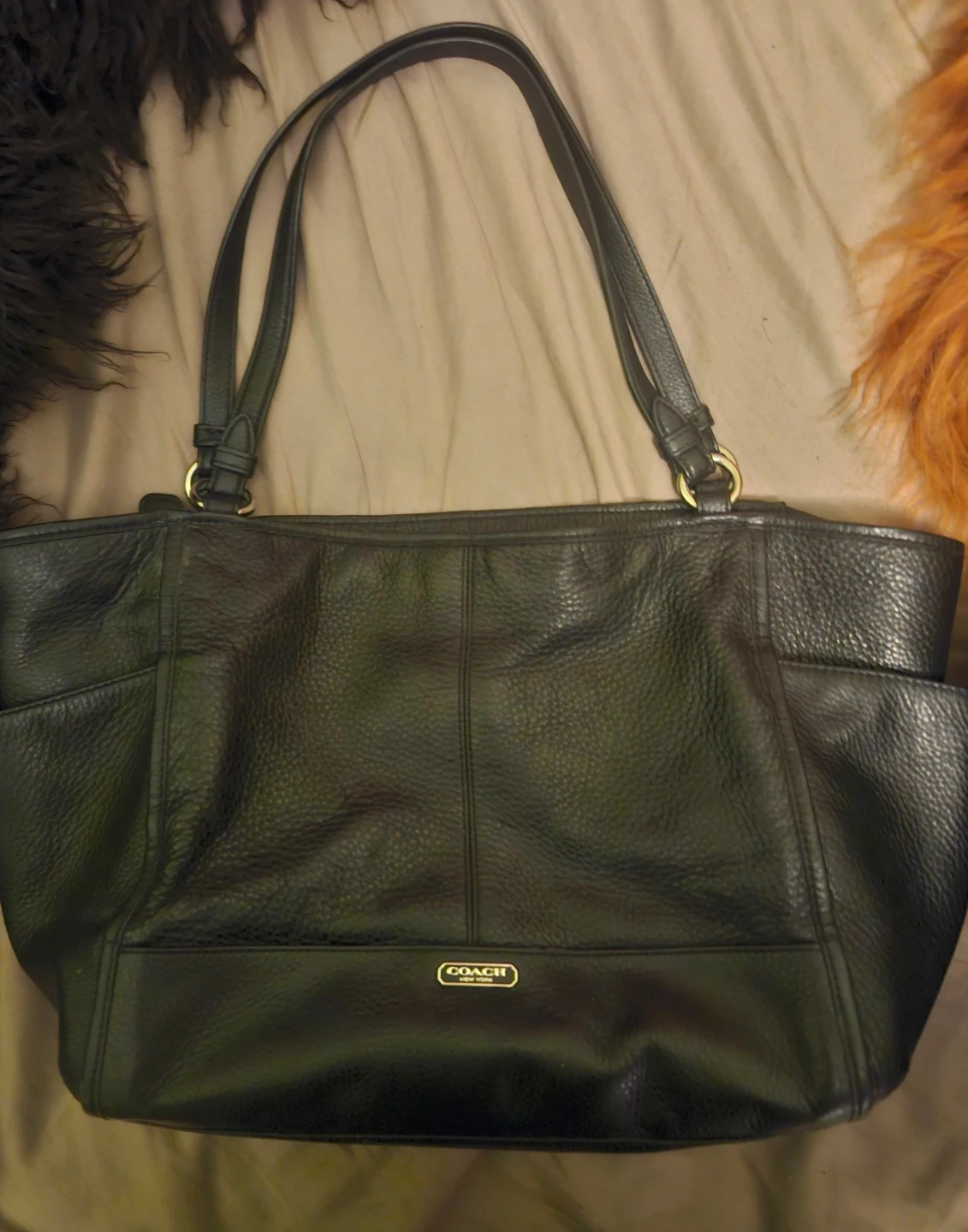 This is a black leather tote bag by Coach. It features a pebbled leather exterior with dual top handles. The interior is lined with satin and includes pockets.