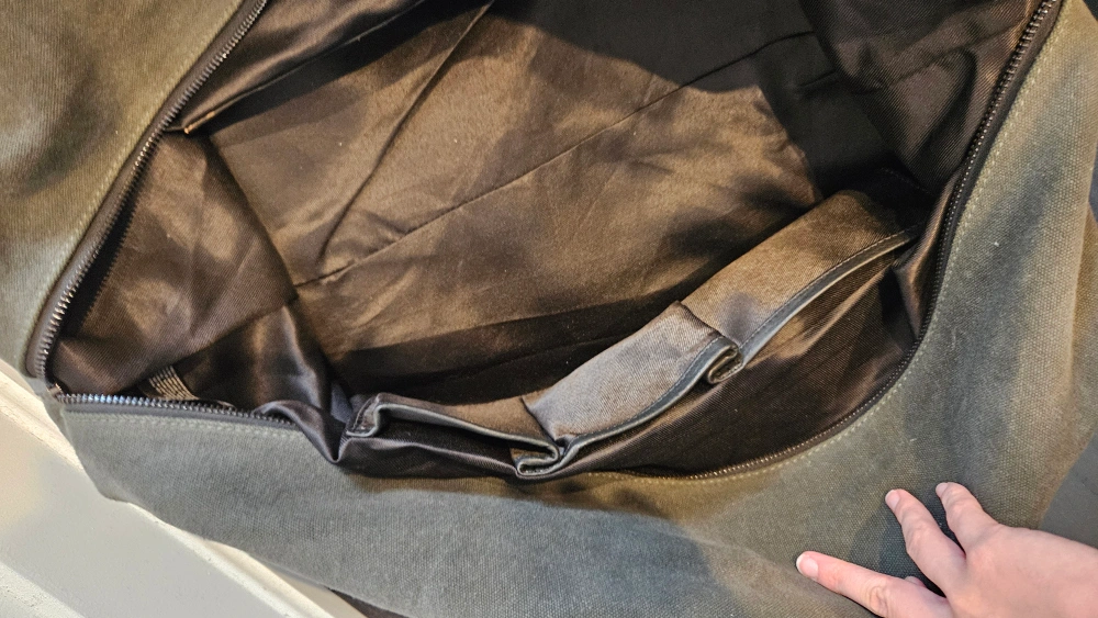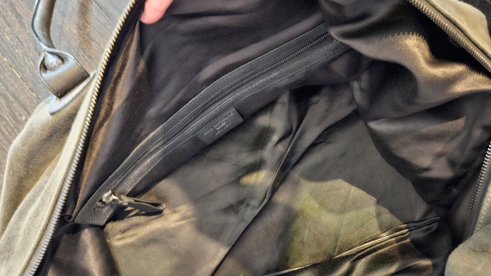 small grey duffle bag. The bag has a large main compartment, a zippered pocket on the inside of the bag, and a zippered closure on the top.