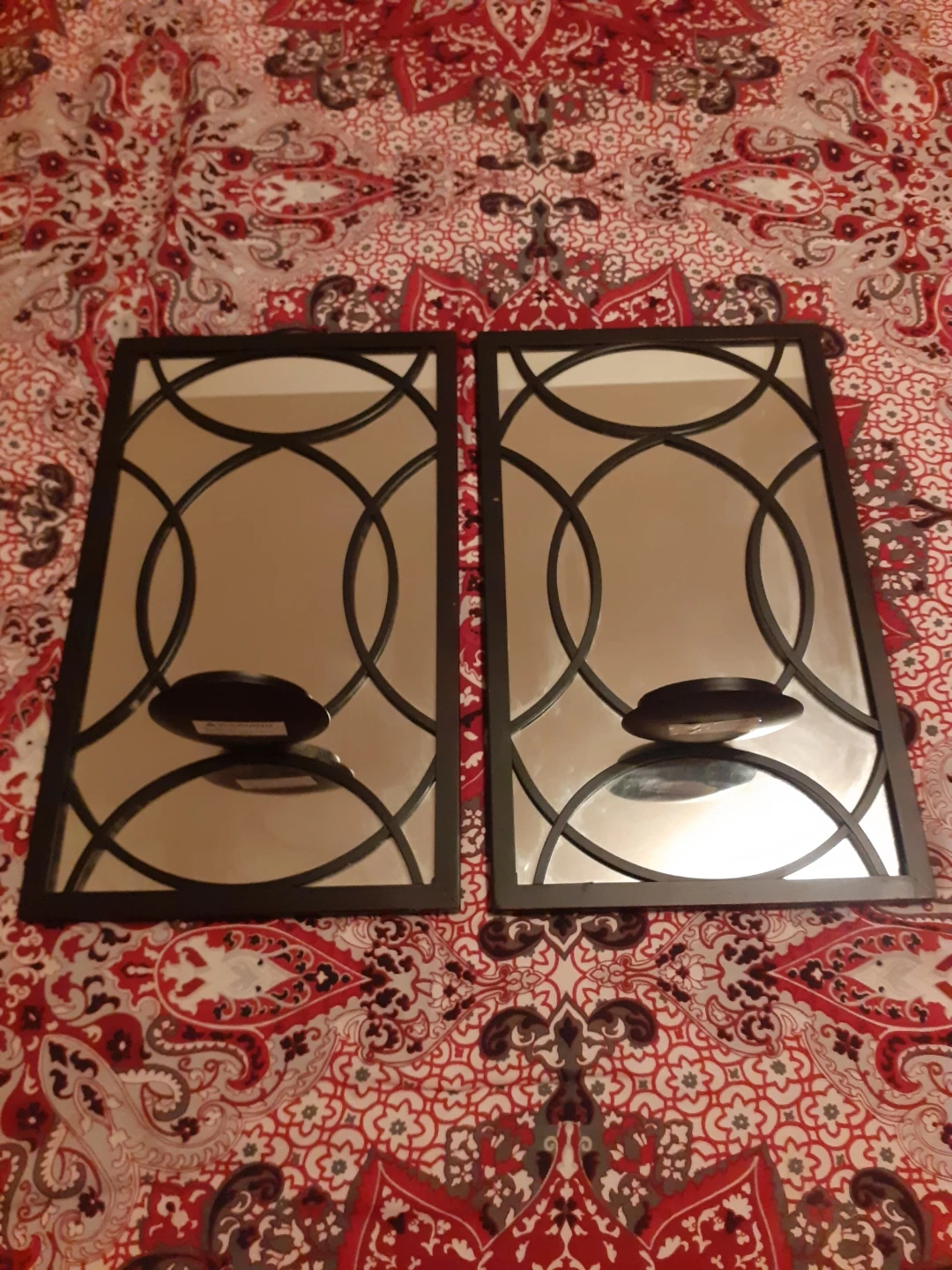 These wall sconces feature mirrored backs with a decorative black metal frame. They include a candle holder. Perfect for adding a touch of elegance to any room! 15 each
