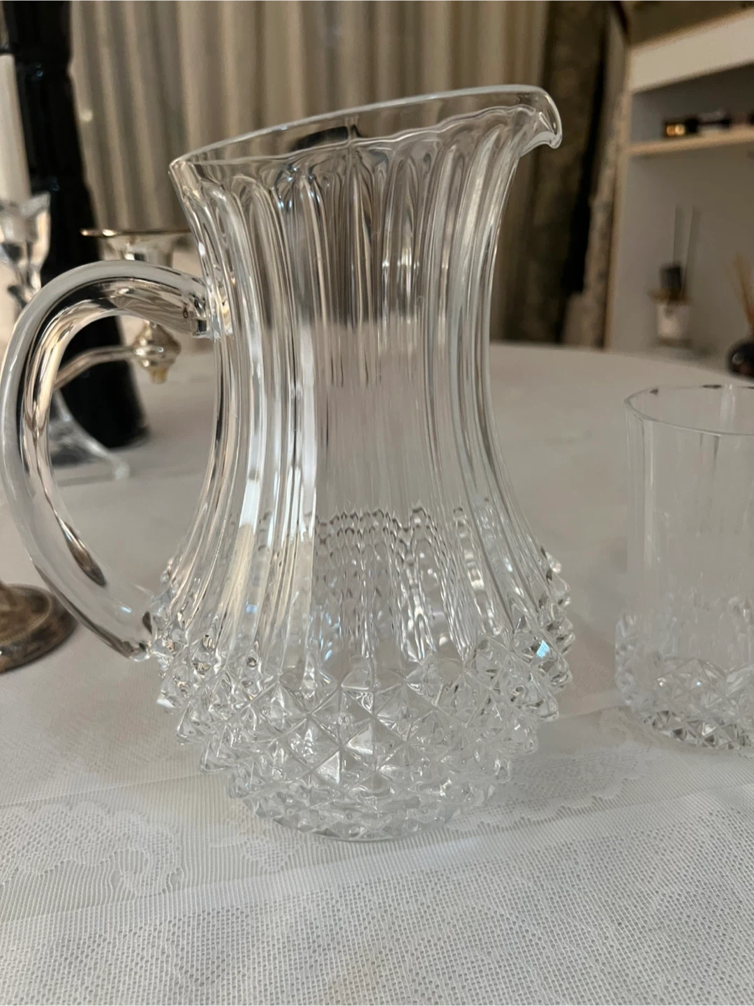 Selling a beautiful crystal pitcher with 6 matching glasses. This set would be a lovely addition to any table setting or a perfect gift for someone special. The crystal is clear and in great condition, ready to add a touch of elegance to your home