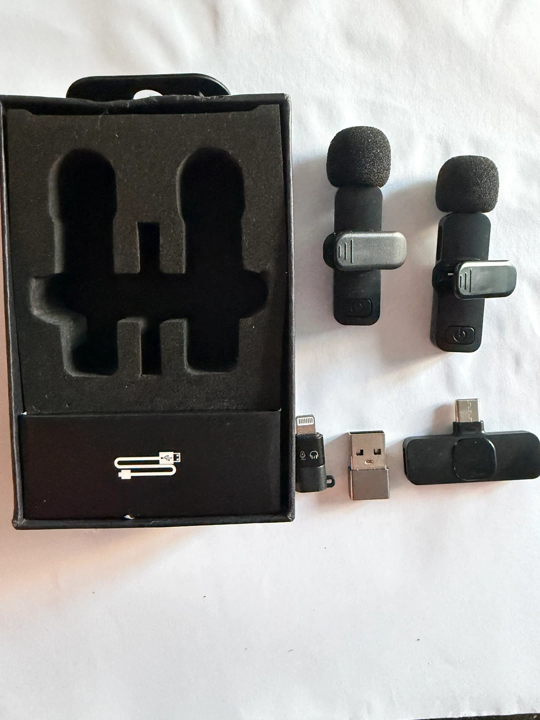 wireless lavalier microphone set for vlogging, interviews, live shows. It includes two microphones and a receiver. It comes with various adapters for connecting to Android and iPhone.