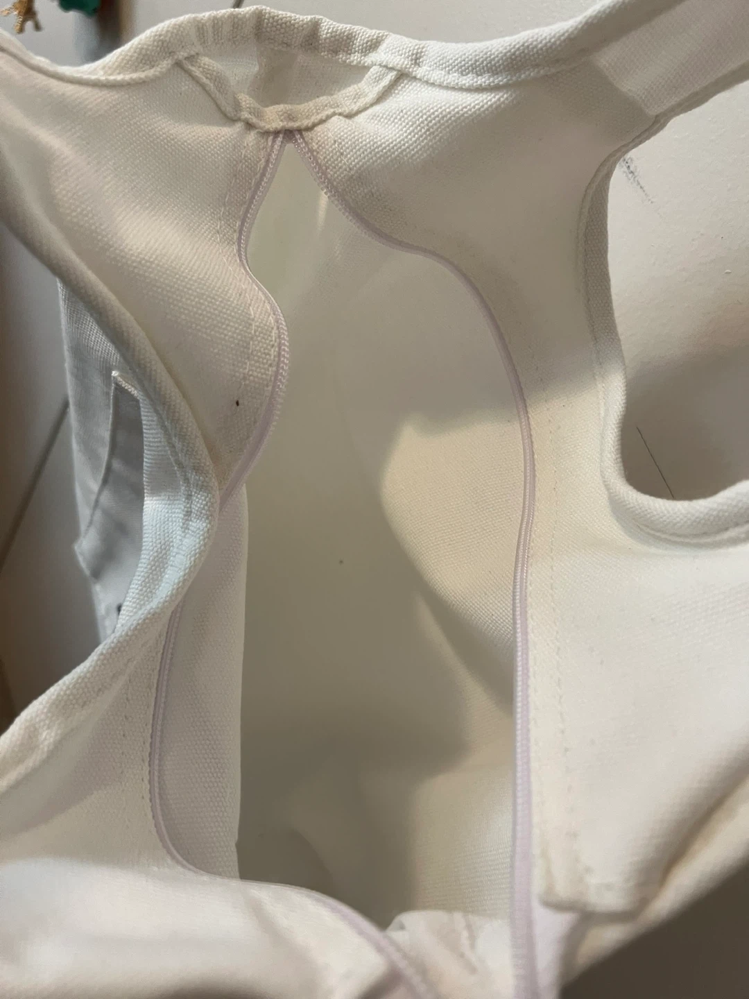 Here's a cute white canvas tote bag! It features a charming bear design on the front pocket, perfect for adding a touch of whimsy to your everyday look. It's a great size for carrying your essentials and is in excellent condition