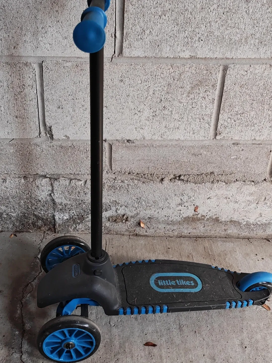 It's a Little Tikes scooter with three wheels for stability. Features a black deck with blue accents and blue handles. Durable plastic construction.