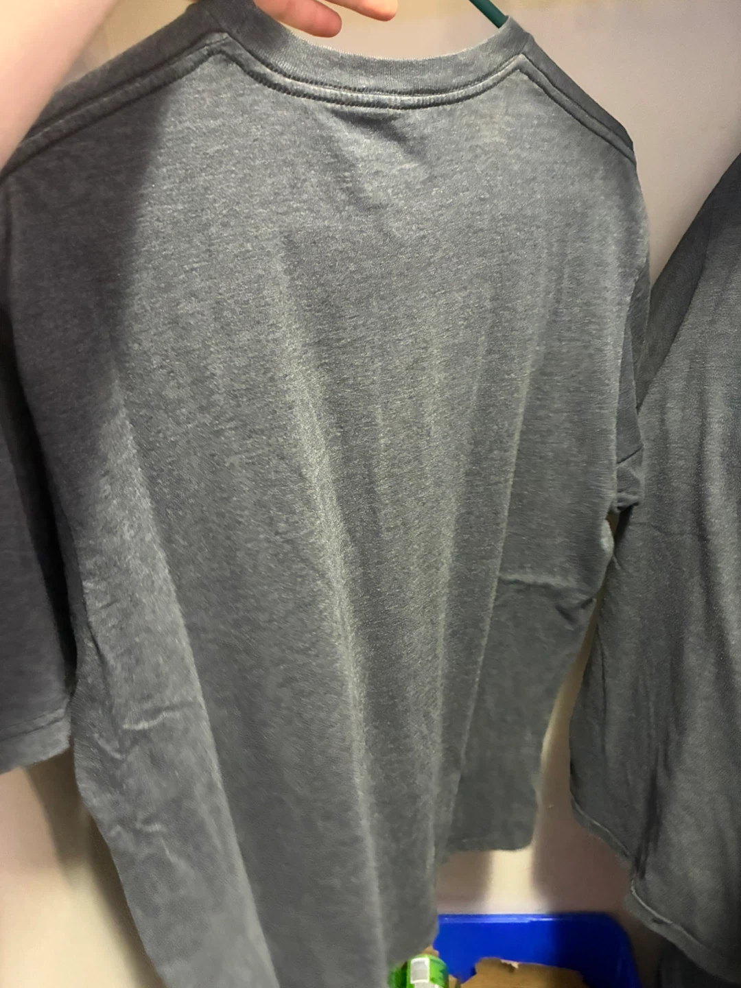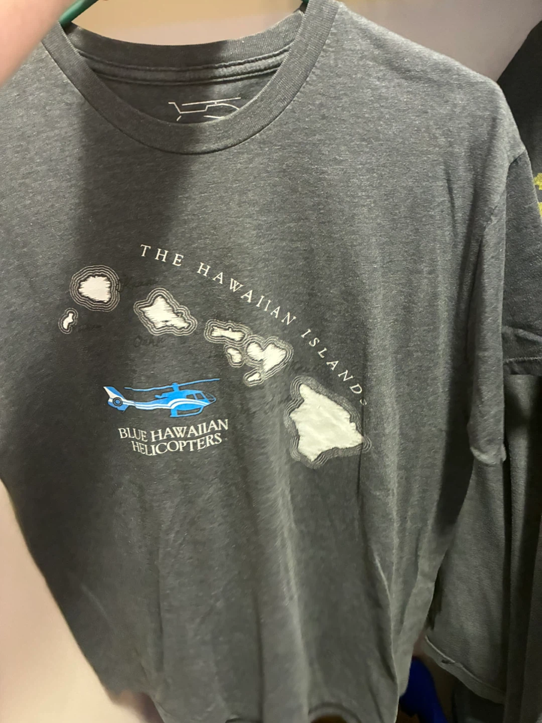 Grey t-shirt featuring "The Hawaiian Islands" and a blue helicopter graphic from Blue Hawaiian Helicopters. Cotton material.