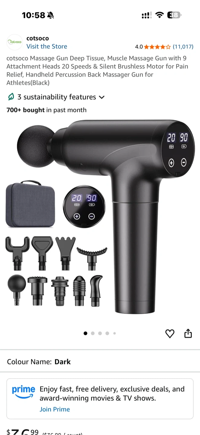 Brand new- Cotsoco massage gun is designed for deep tissue and muscle relief. It features 20 adjustable speed settings and a silent brushless motor. Included are 9 different attachment heads for targeted therapy, all stored in a convenient carrying case.