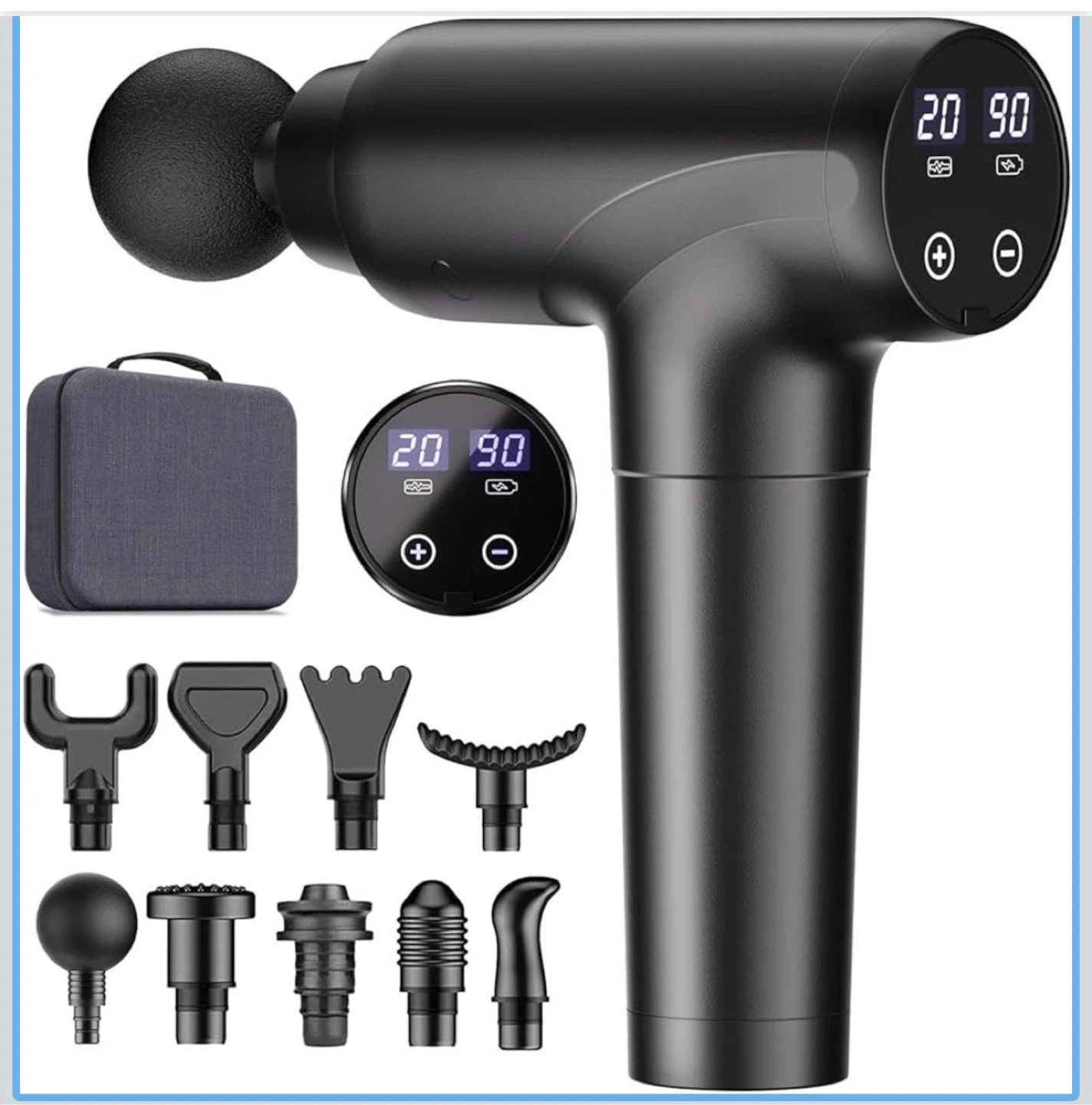 Brand new- Cotsoco massage gun is designed for deep tissue and muscle relief. It features 20 adjustable speed settings and a silent brushless motor. Included are 9 different attachment heads for targeted therapy, all stored in a convenient carrying case.