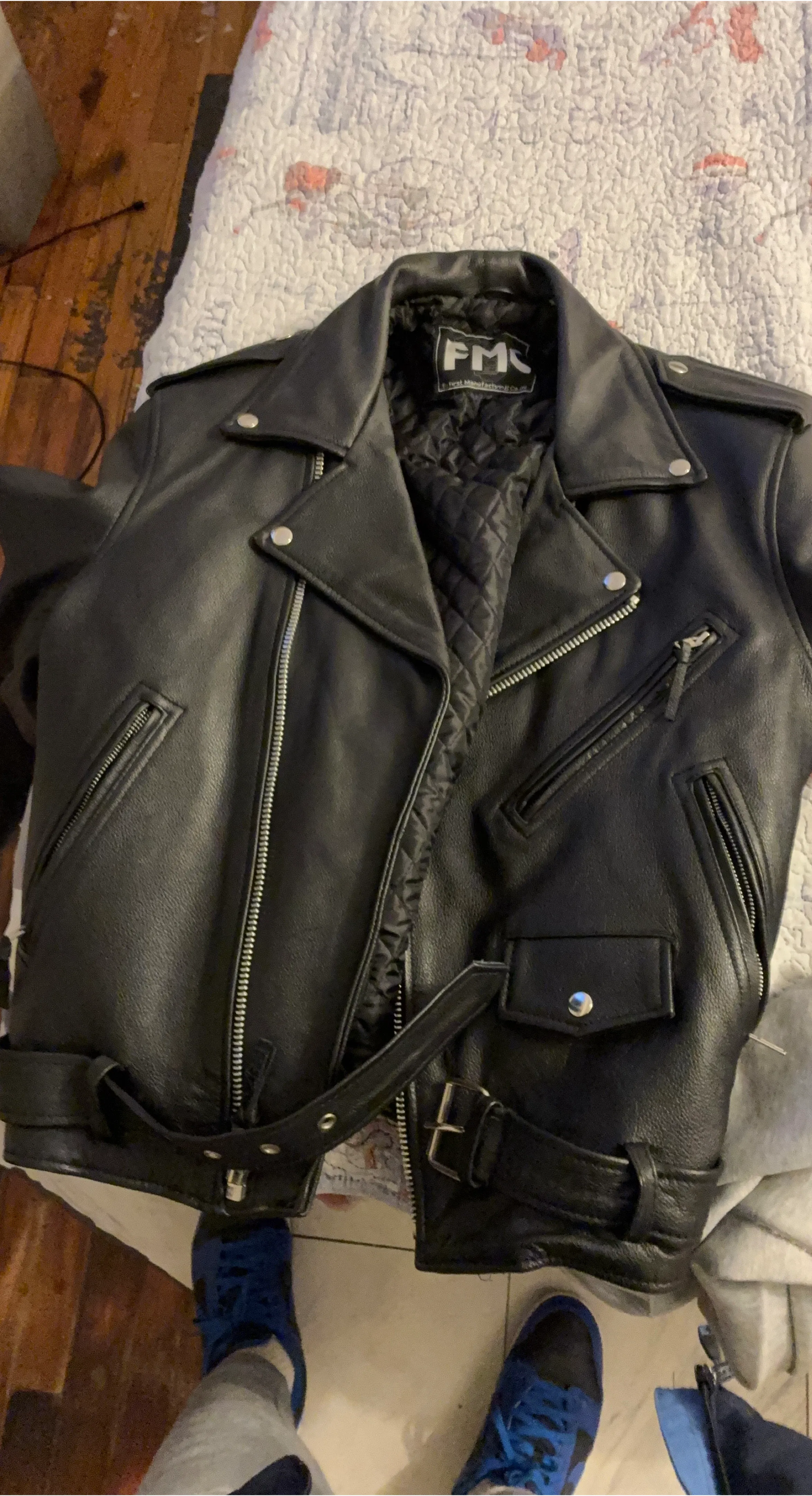 Buy & SellFMC Black Leather Motorcycle JacketFMC Black Leather Motorcycle Jacket$111Classic black leather motorcycle jacket with quilted lining. Features zippered pockets and a belted waist. Made from genuine leather for durability.ConditionNewSizeMBrandFMCWHERE TO MEETCheck LocationView MapSELLERverifiedJelani bBronx Park East750 reviews2 chats·0 favorites·24 viewsSEND CHAT TO SELLERHi Jelani b! I’m interested in your listing.Hi Jelani b! I’m interested in your listing.Get the Karrot app to chatSign In to chat