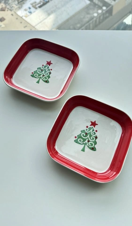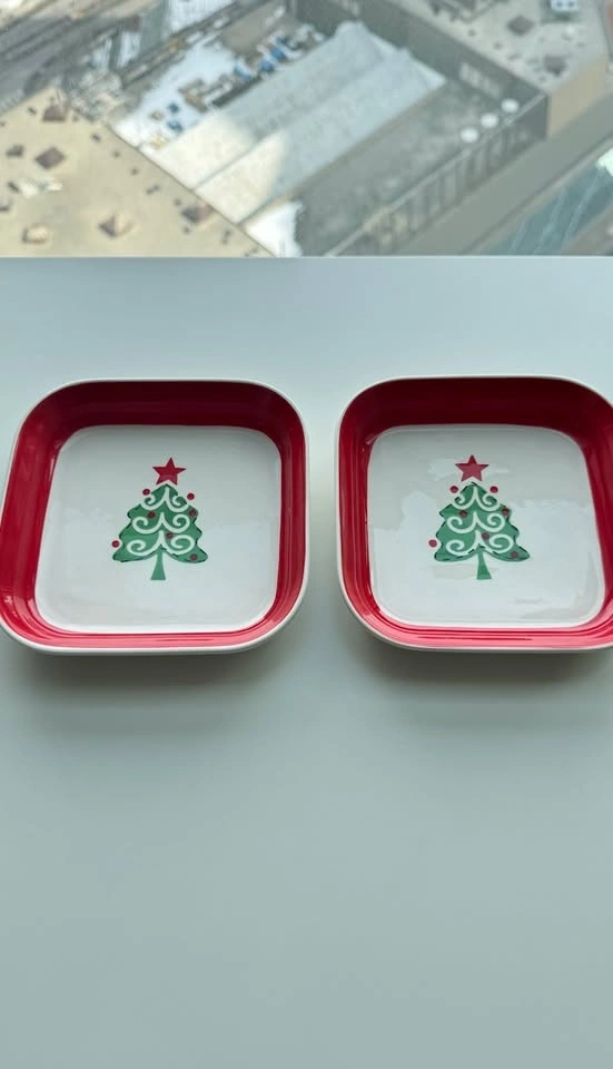 Festive ceramic plates by Paşabahçe featuring a Christmas tree design and red rim. Perfect for serving desserts, cookies, snacks, or appetizers during the holidays. Great for Christmas hosting, dessert tables, or seasonal table settings. Set includes 2 plates. Good condition. No chips, cracks, or damage to the pattern. Dimensions: 6 × 6 inches.