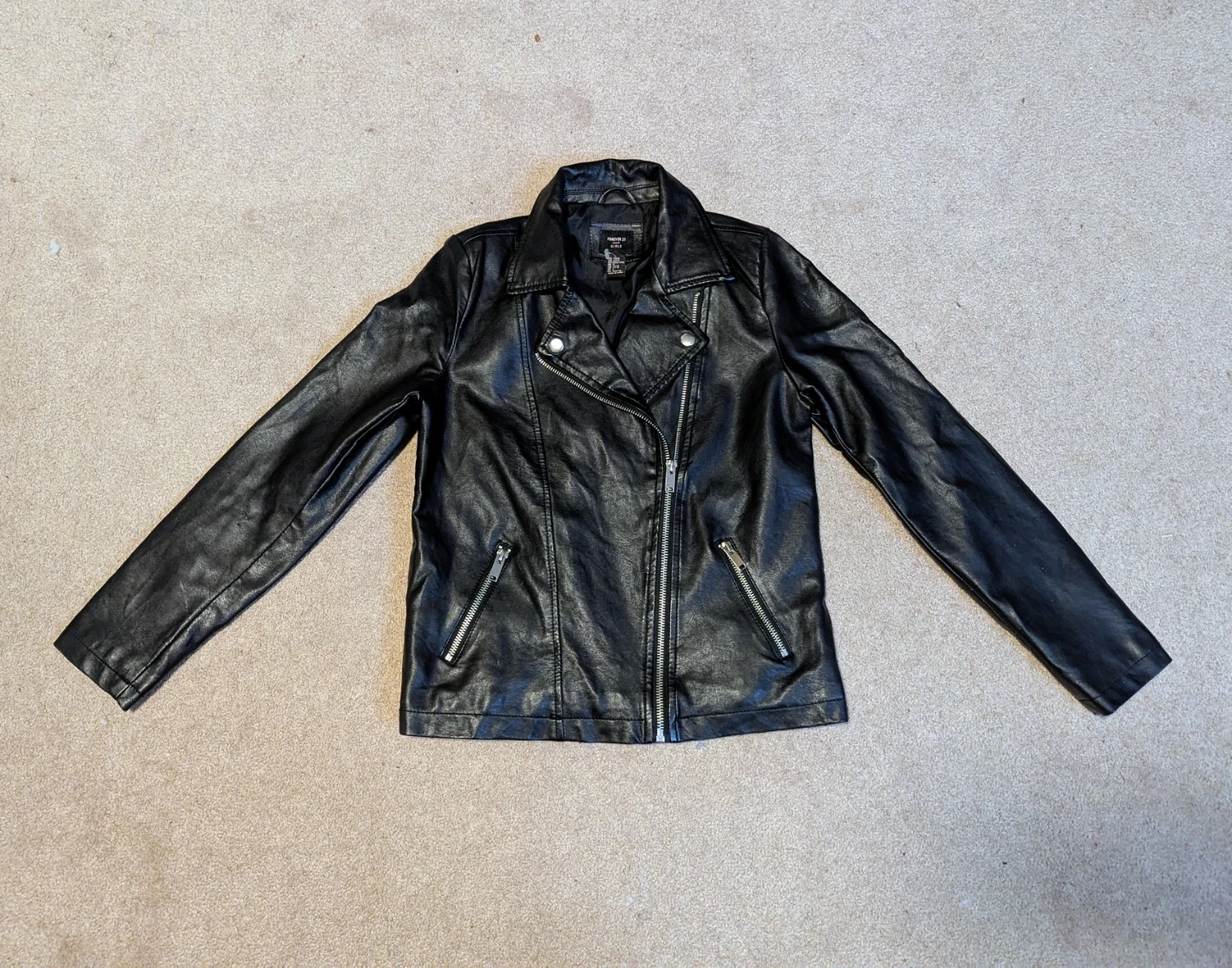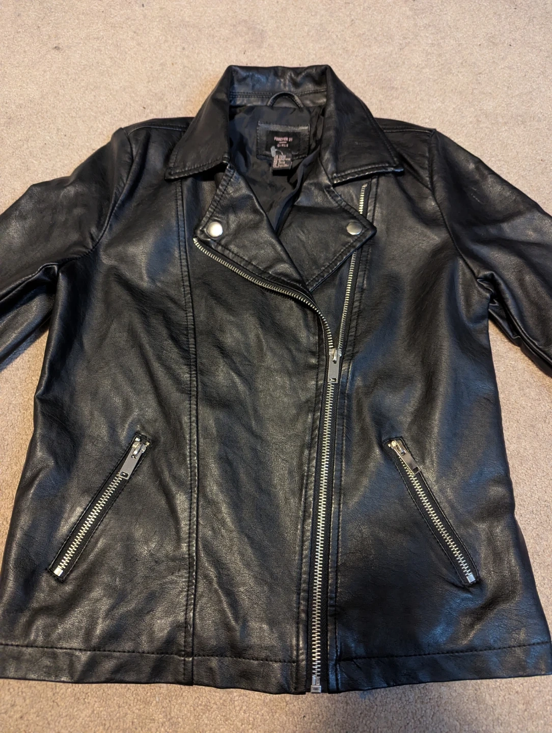 This black faux leather moto jacket is from Forever 21. It's a girls' size 10/12. Fully lined with a zipped front and pockets. In great condition, zippers all intact. Smoke free home. Pick up in Ajax, Westney Heights area.
