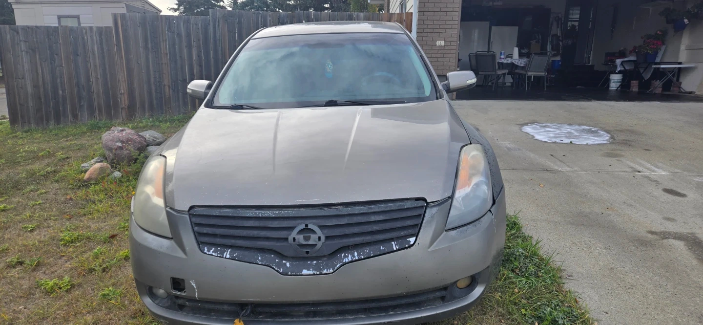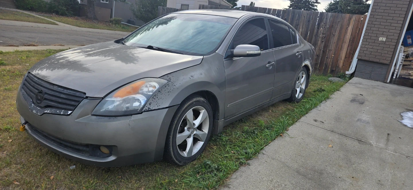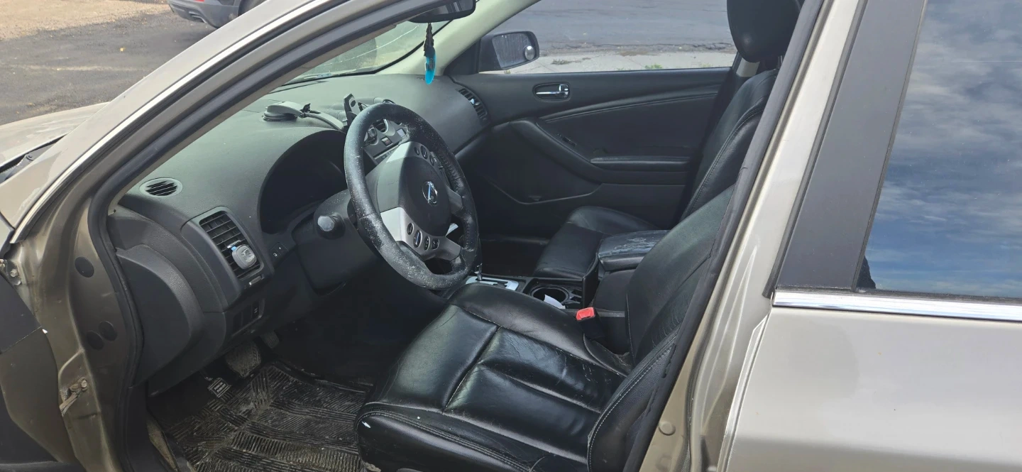 This is a Nissan Altima 3.5 SE sedan with a V6 engine. It has black leather interior and a tan exterior. Runs and drives, but requires some TLC. Engine bay appears to be clean and well-maintained.