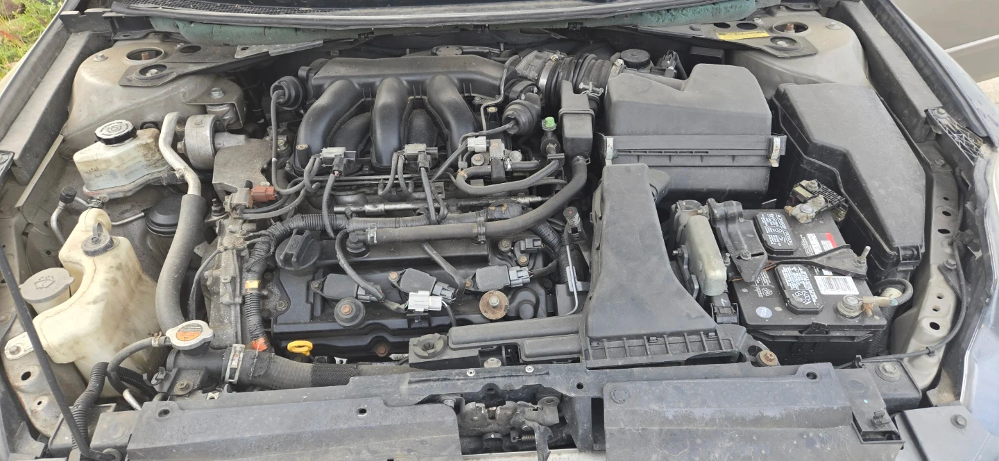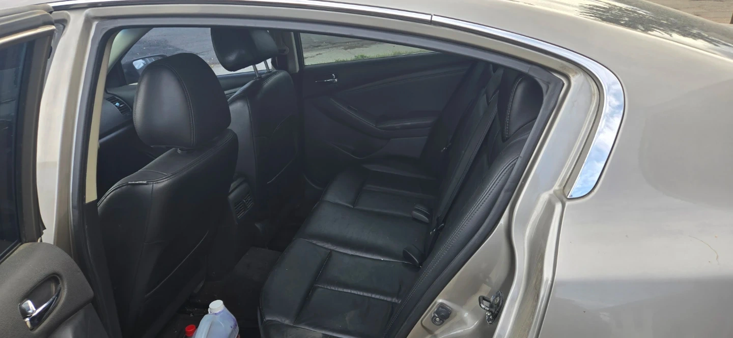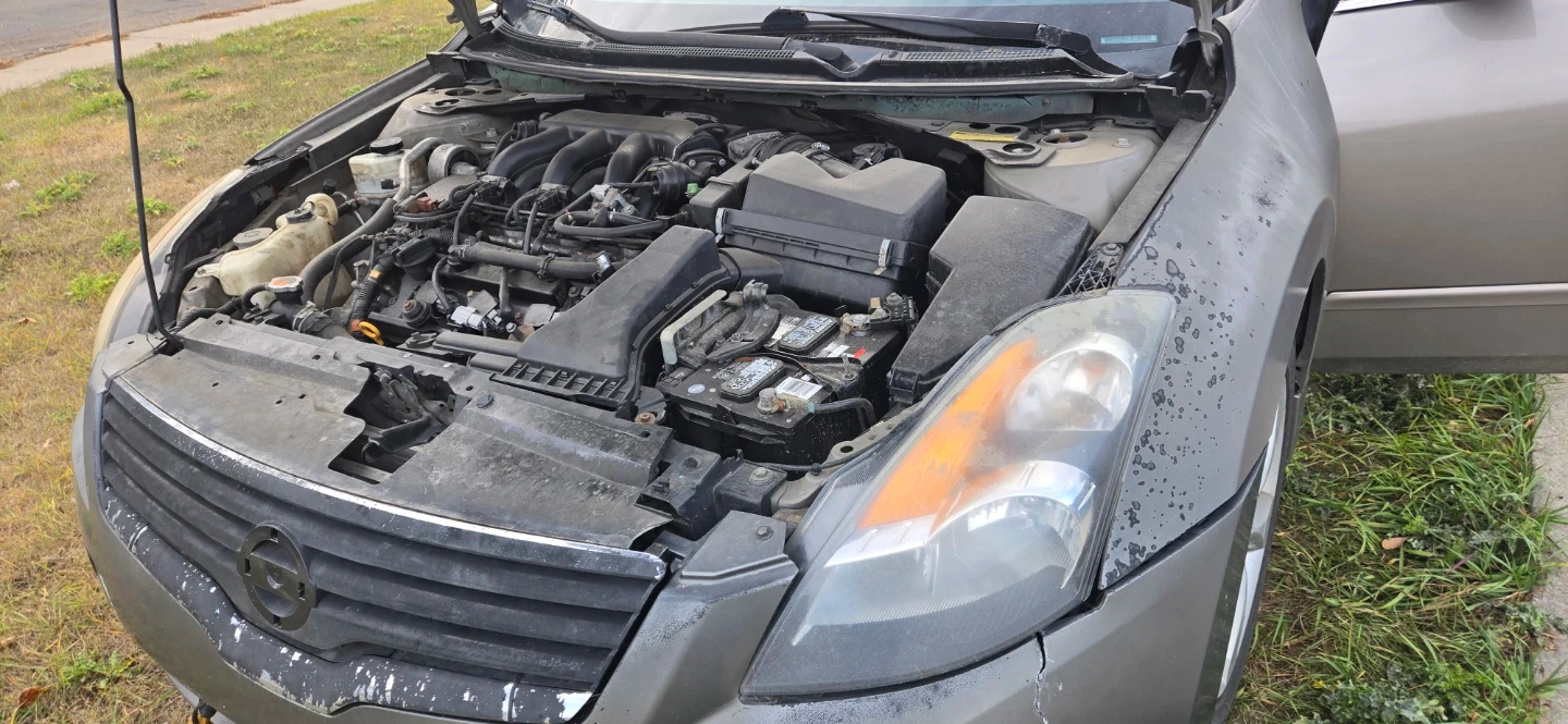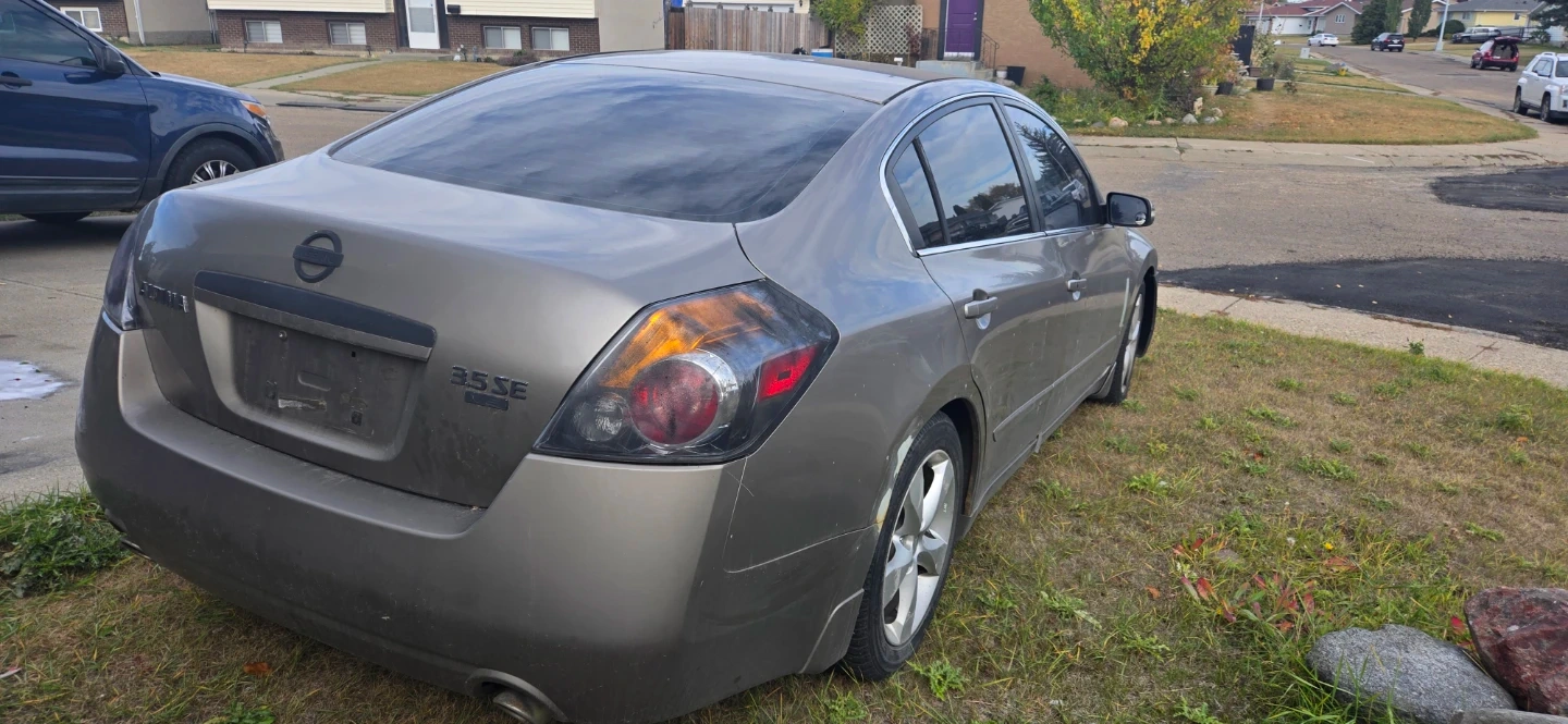 This is a Nissan Altima 3.5 SE sedan with a V6 engine. It has black leather interior and a tan exterior. Runs and drives, but requires some TLC. Engine bay appears to be clean and well-maintained.