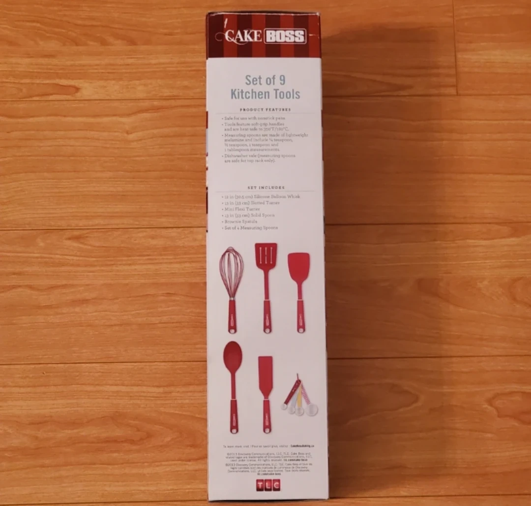 This CAKE BOSS 9 piece Kitchen tool set is brand new. Each item is still sealed in plastic inside the box.
