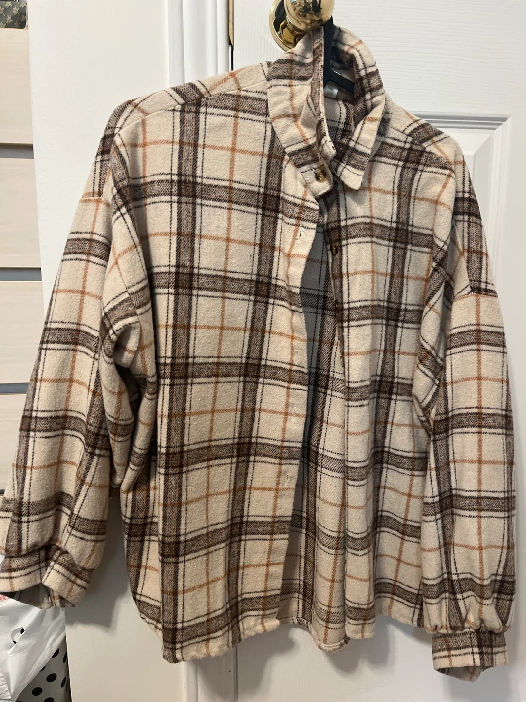 Here’s a cozy beige-and-brown plaid flannel shirt.It’s perfect for spring or fall, made from a slightly thicker material.It’s in great condition and is a stylish, comfortable addition to any wardrobe.