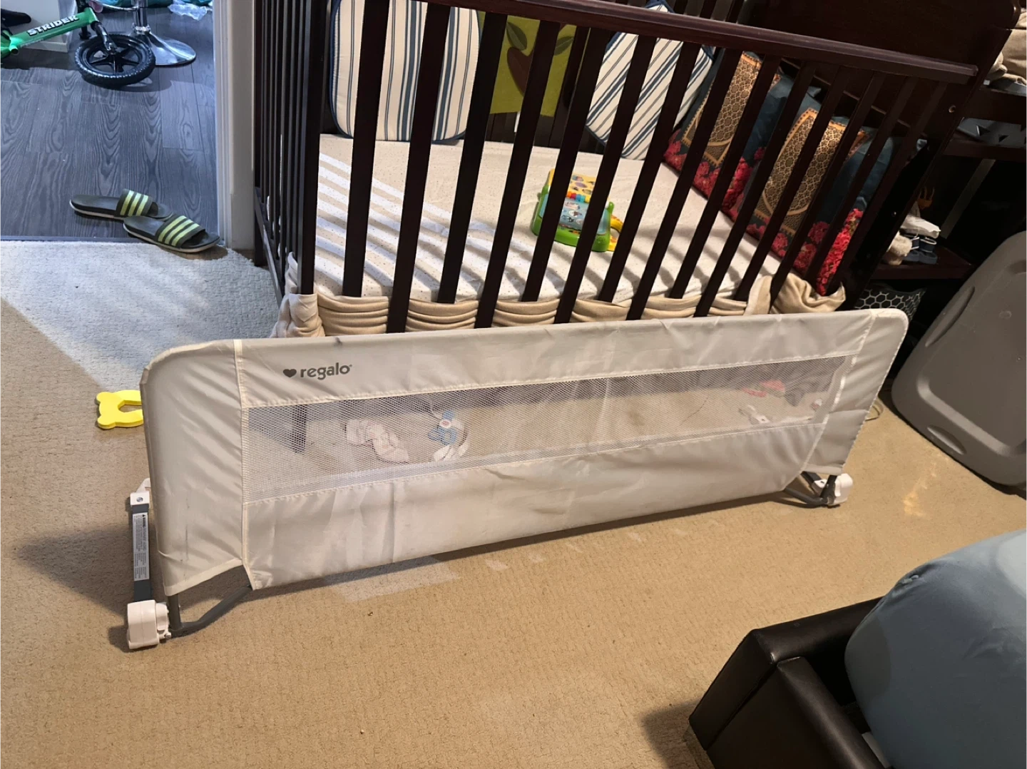This is a Regalo bed rail guard. It's designed to help keep children safe in bed. Mesh fabric with fabric cover. Includes adjustable straps for securing.