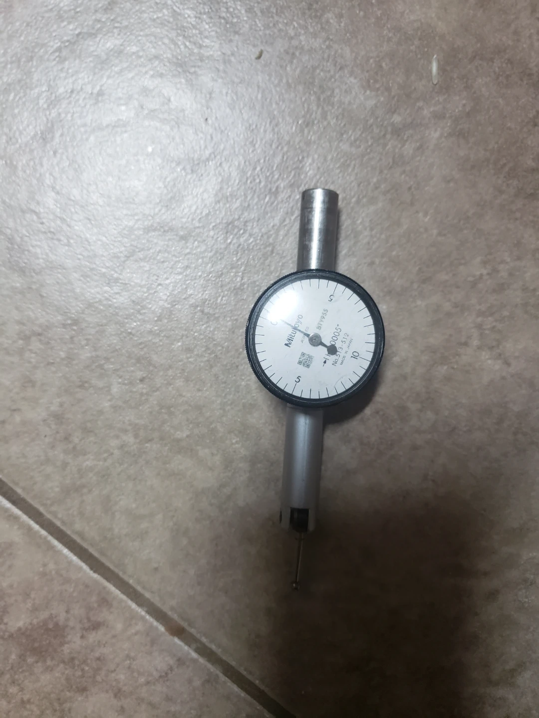 This is a Mitutoyo test indicator. It has a .0005 inch increment with a total range of .200 inches. The dial reads to 100 divisions.