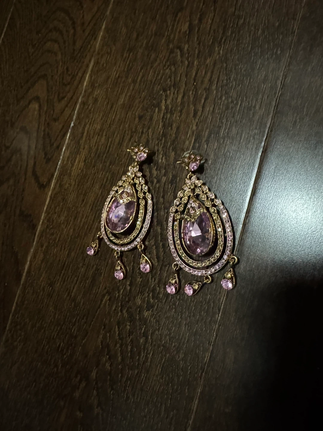 Beautiful large drop earrings featuring pink gemstones and intricate gold-tone metalwork. They hang to create a dramatic and elegant look! These earrings are perfect for adding some sparkle to a formal outfit.