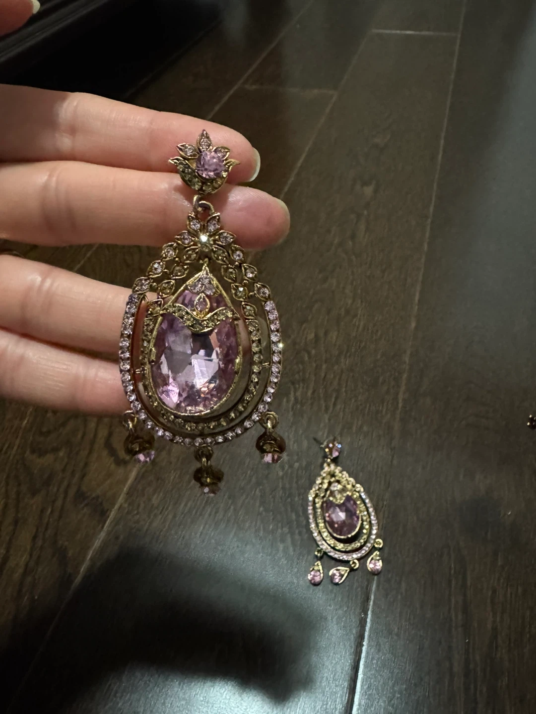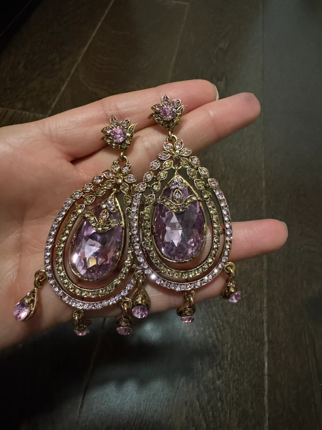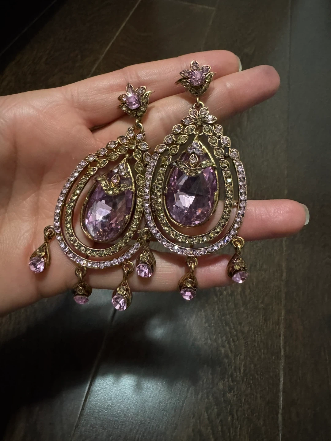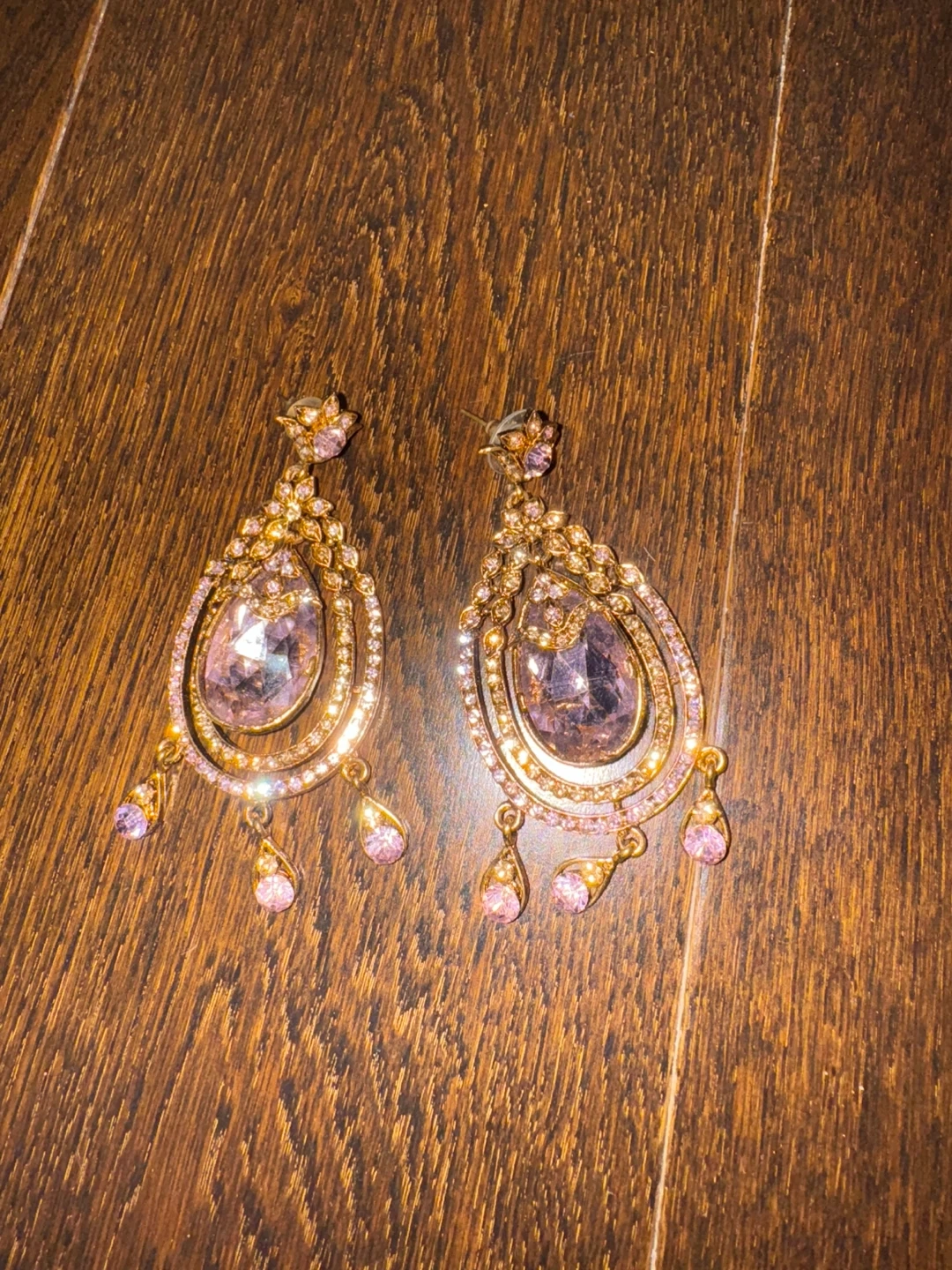 Beautiful large drop earrings featuring pink gemstones and intricate gold-tone metalwork. They hang to create a dramatic and elegant look! These earrings are perfect for adding some sparkle to a formal outfit.