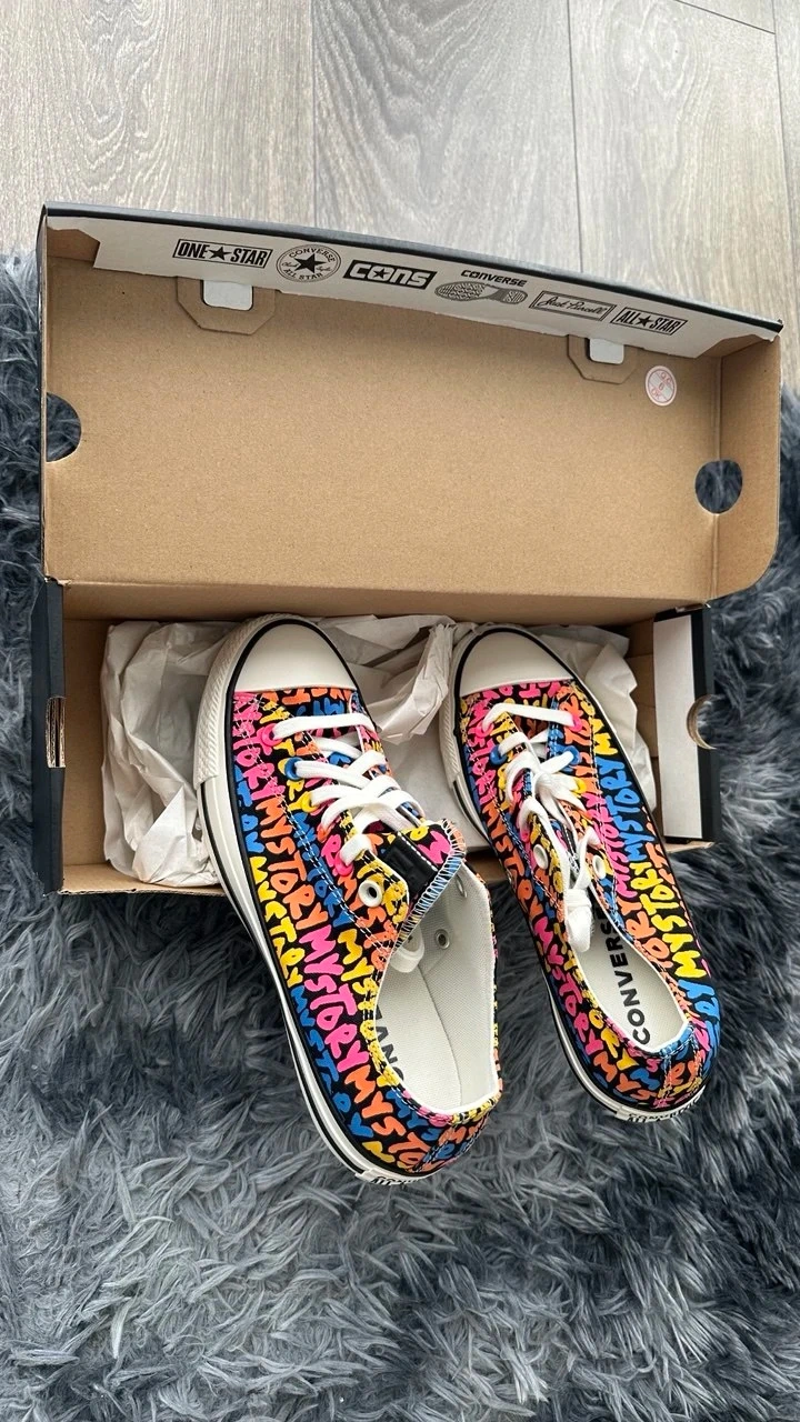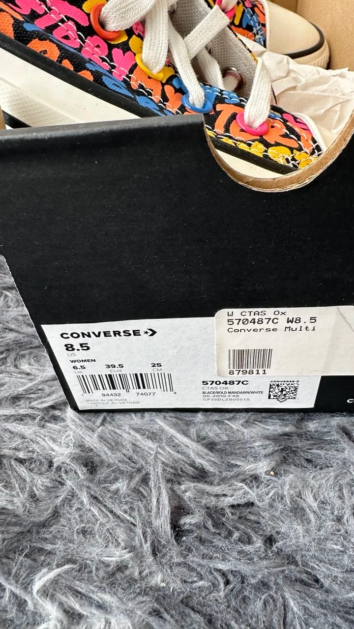Pick up is Woodbine and Danforth. These Converse Chuck Taylor All Star Ox shoes feature a vibrant "MyStory" graphic print. They're a women's size 8.5. Includes the original box.