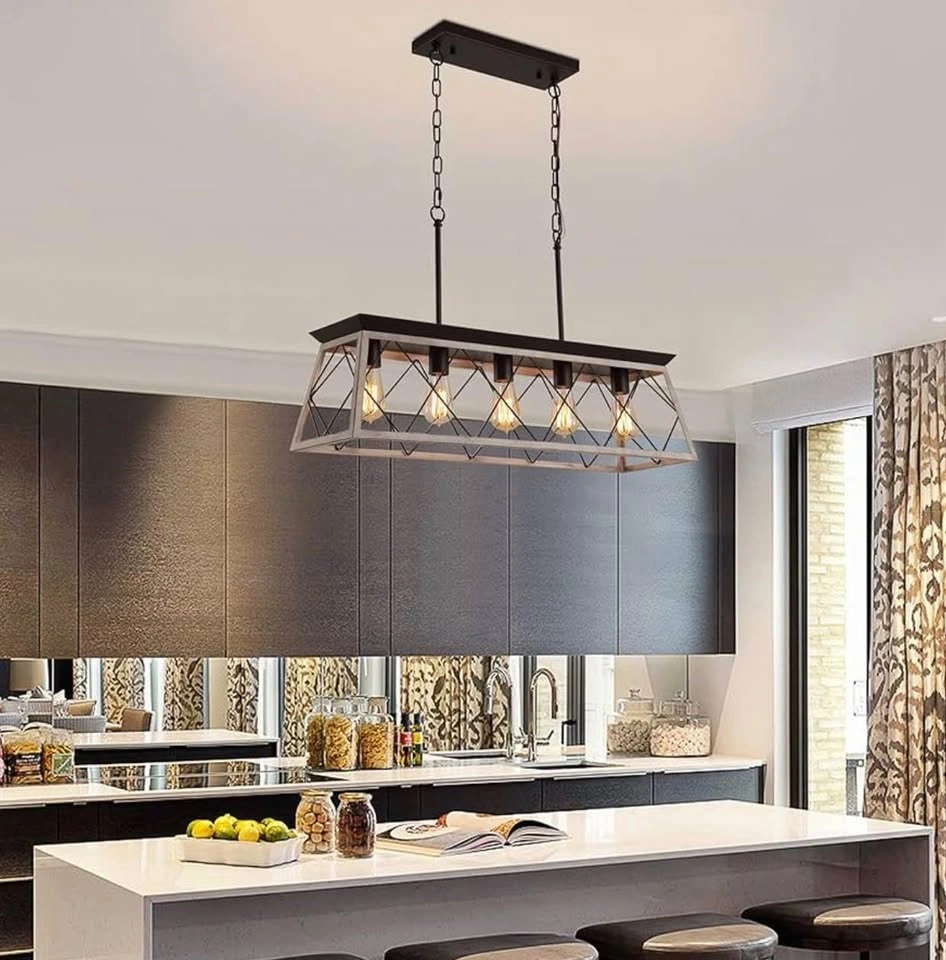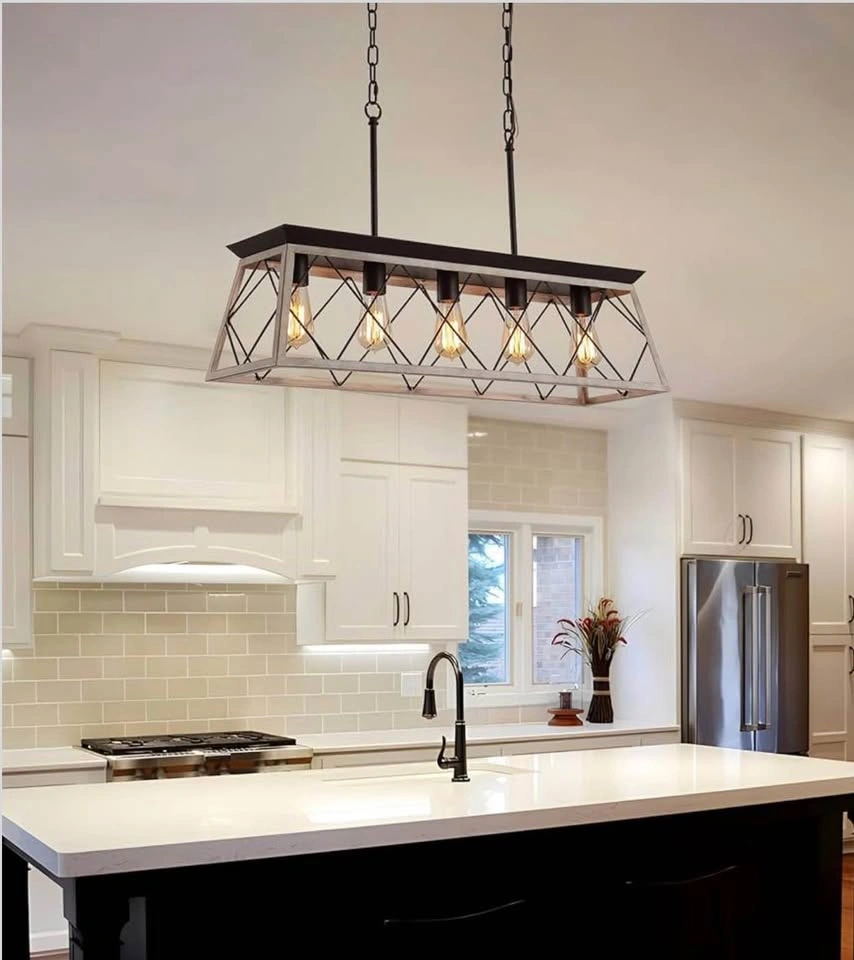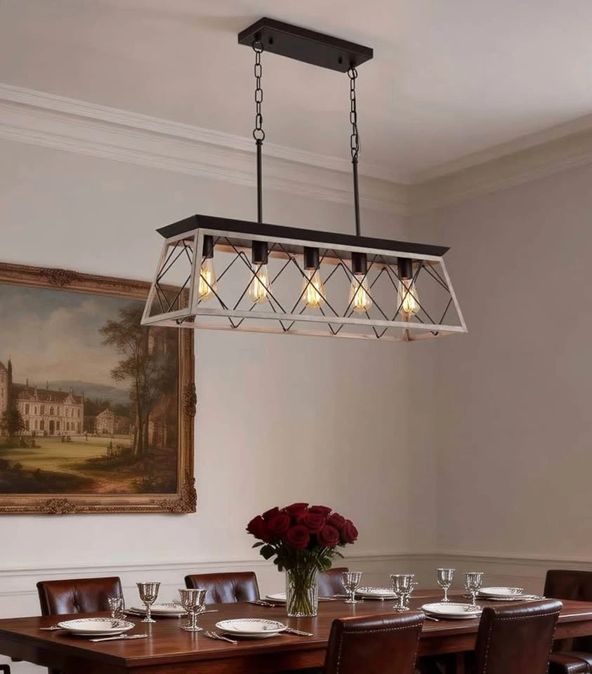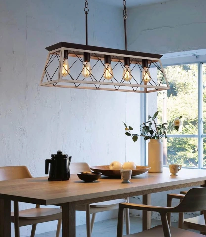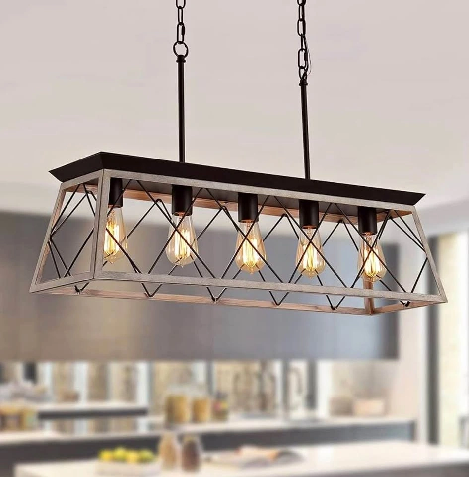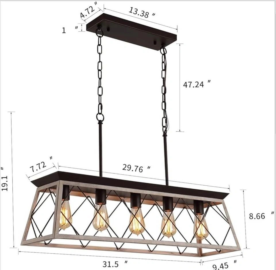 Farmhouse rustic vintage industrial country style chandelier with an oak and ORB finish. Linear metal wood-look pendant light, suitable for dining room, bar, office, or coffee shop.