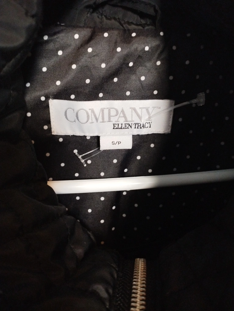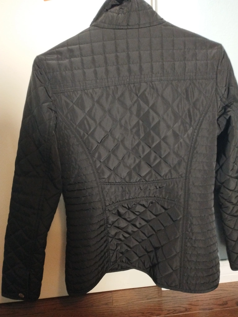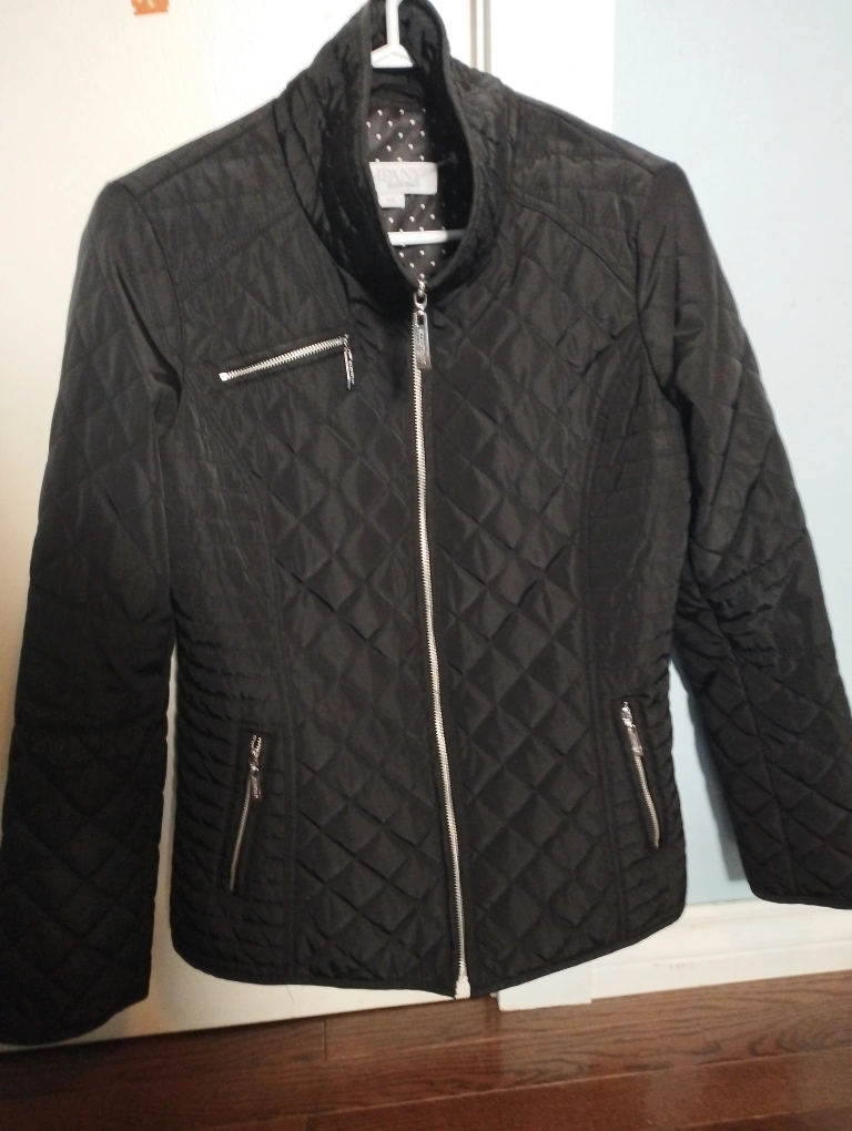 Black quilted jacket. Size Small/Petite. Zipper closure and two zippered pockets on the front. Two zippered pockets on the inside.