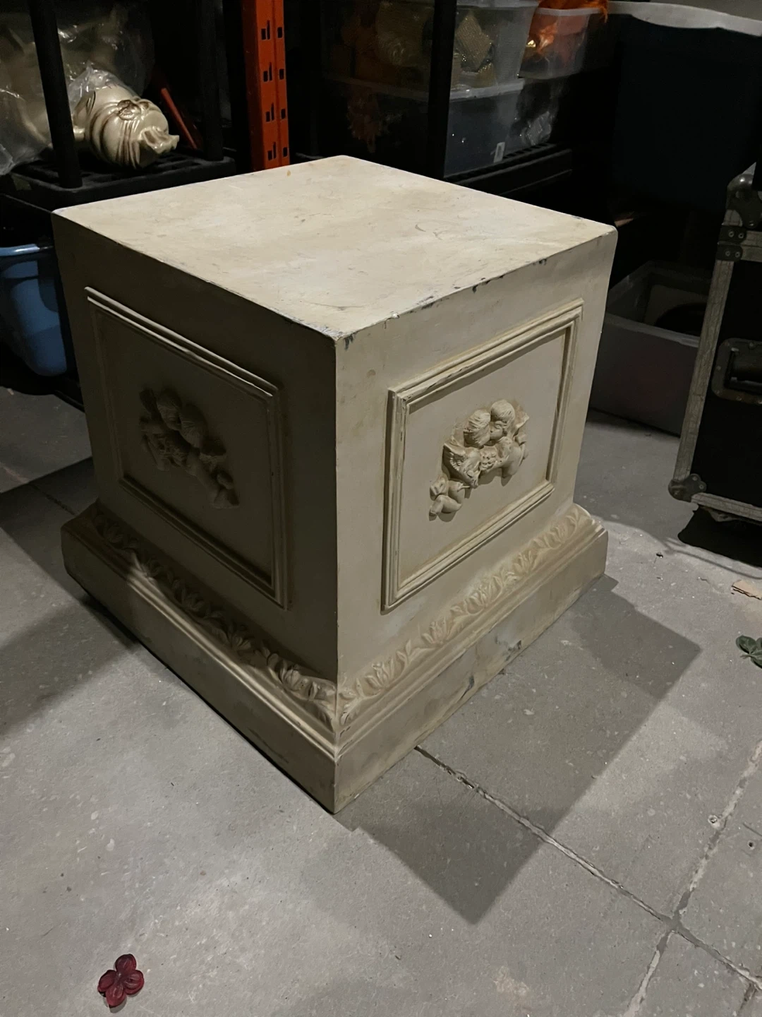 A decorative pedestal stand with ornate relief carvings. It's made of a durable material and features a classic, neutral finish. This pedestal could support a plant, statue, or other decorative items.