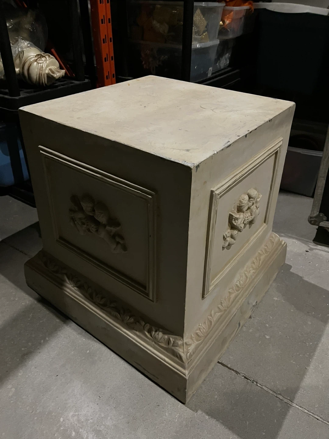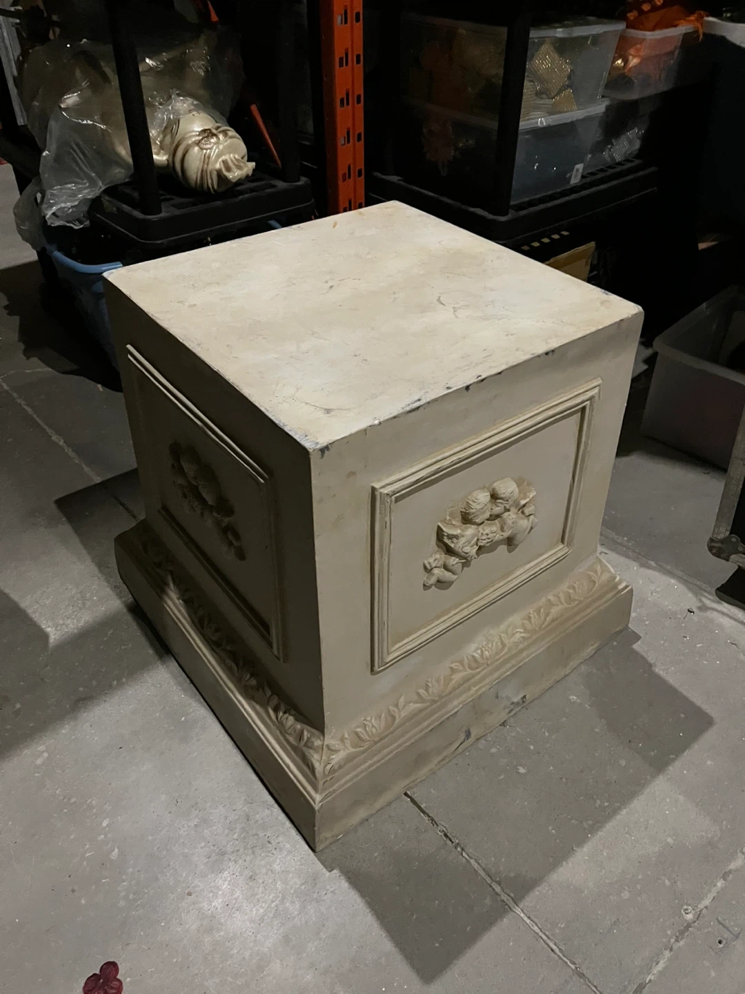 A decorative pedestal stand with ornate relief carvings. It's made of a durable material and features a classic, neutral finish. This pedestal could support a plant, statue, or other decorative items.