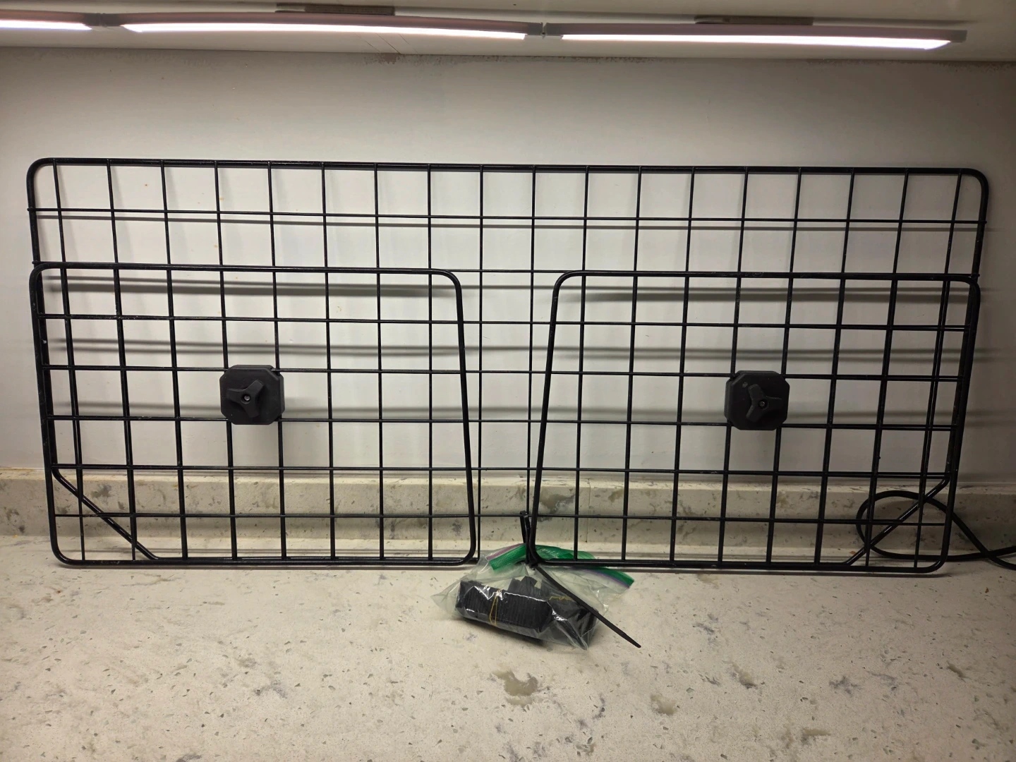 This is a car dog barrier for SUVs, vans, and vehicles. It's made of metal and includes mounting hardware. Keep your pets safe and secure on the road!