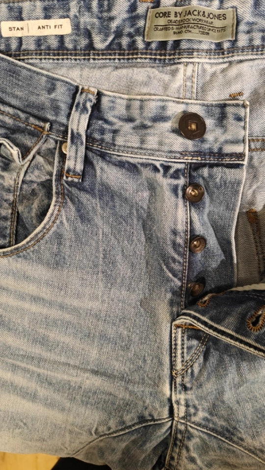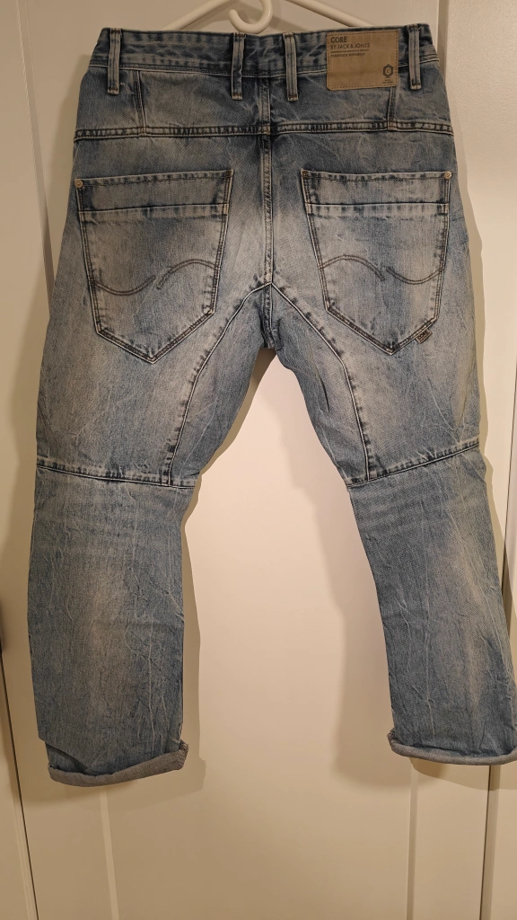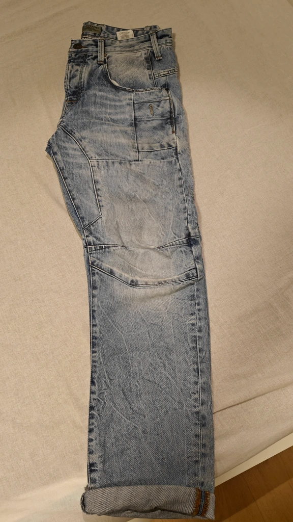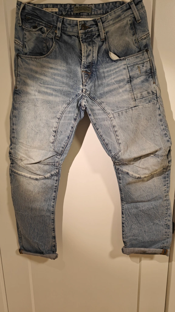 Light wash denim jeans. Anti-fit style. Multiple pockets. Rolled cuffs. A very durable material.