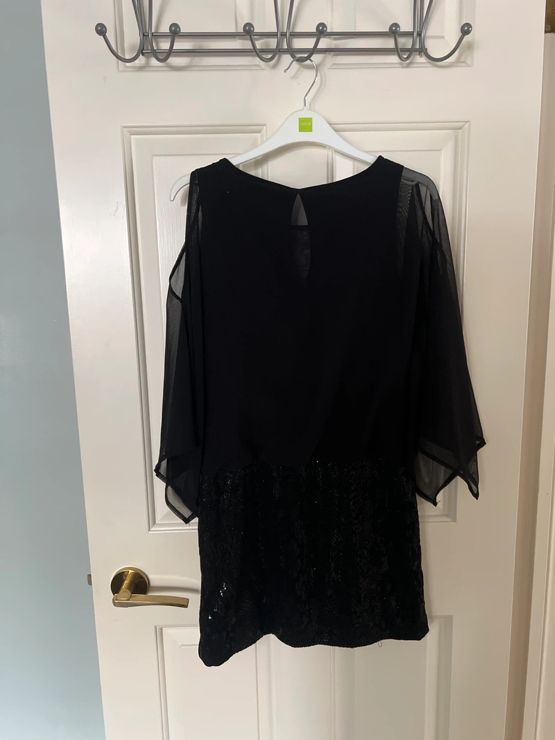 Selling a Picadilly Fashions dress in black. It's a size XS. The dress features a unique design with sheer sleeves and a sequined bottom. Perfect for a night out!