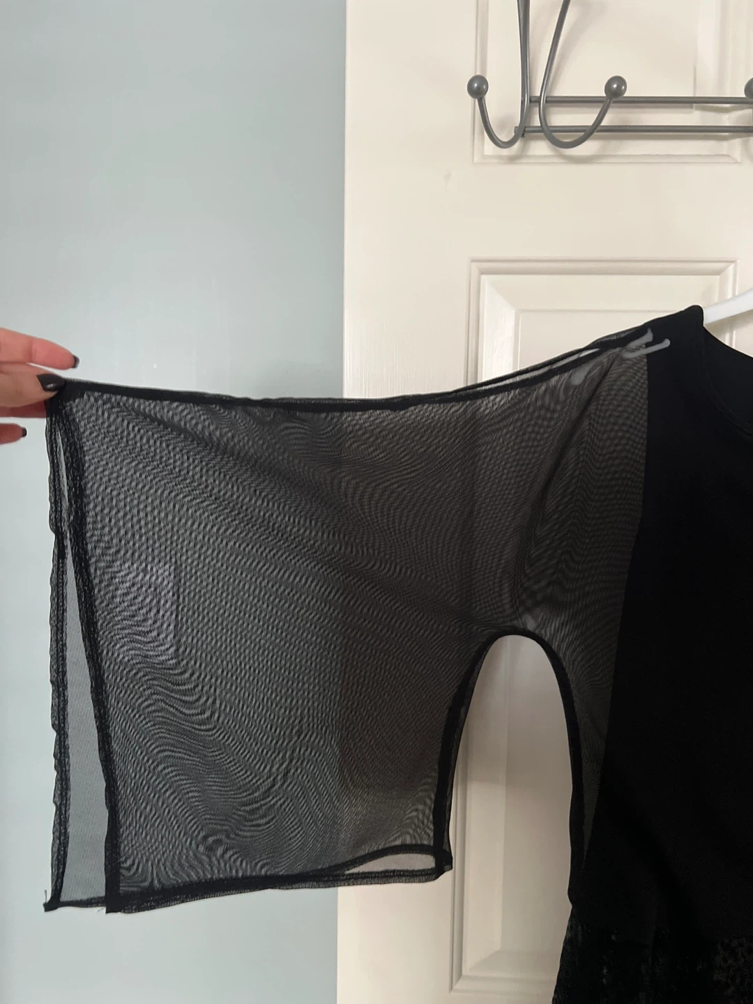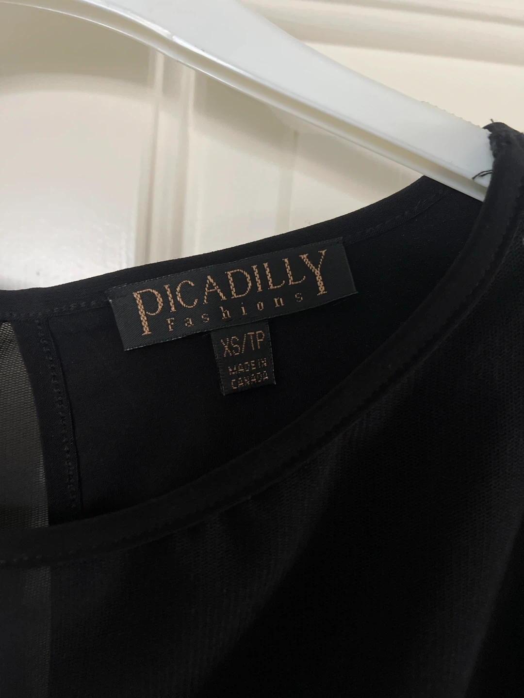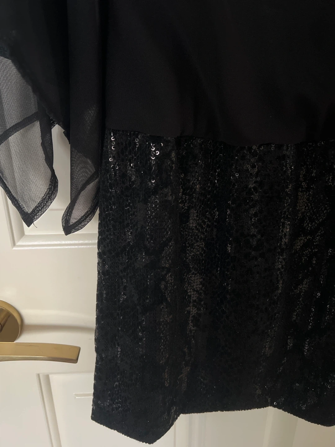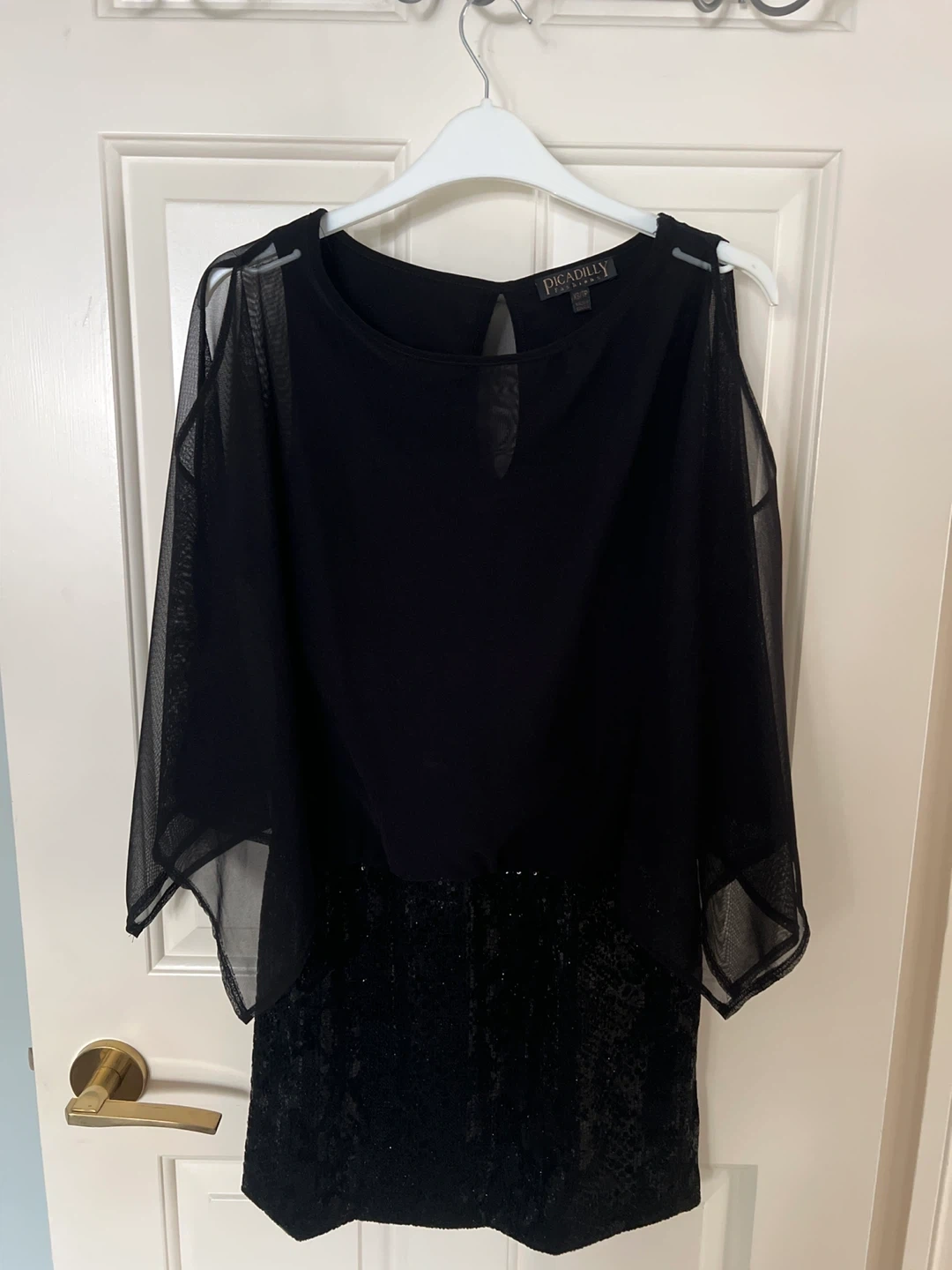 Selling a Picadilly Fashions dress in black. It's a size XS. The dress features a unique design with sheer sleeves and a sequined bottom. Perfect for a night out!
