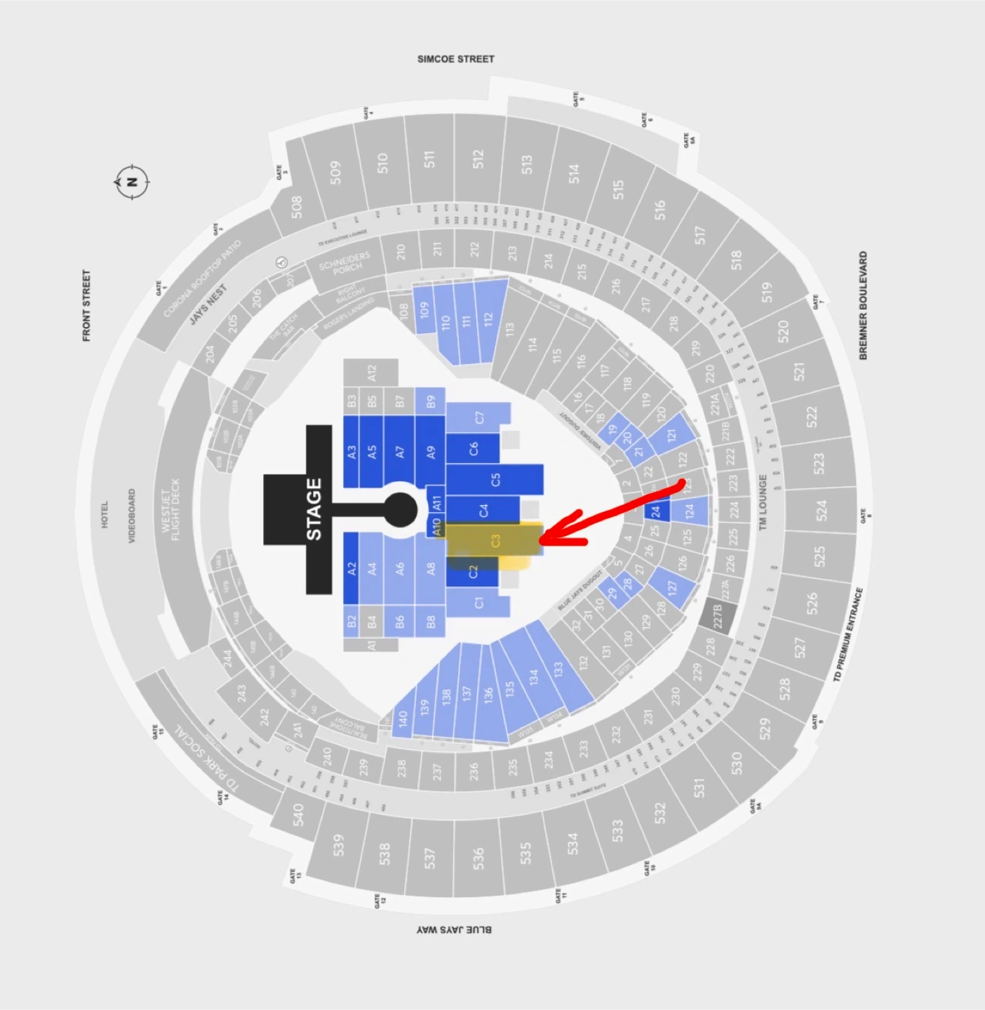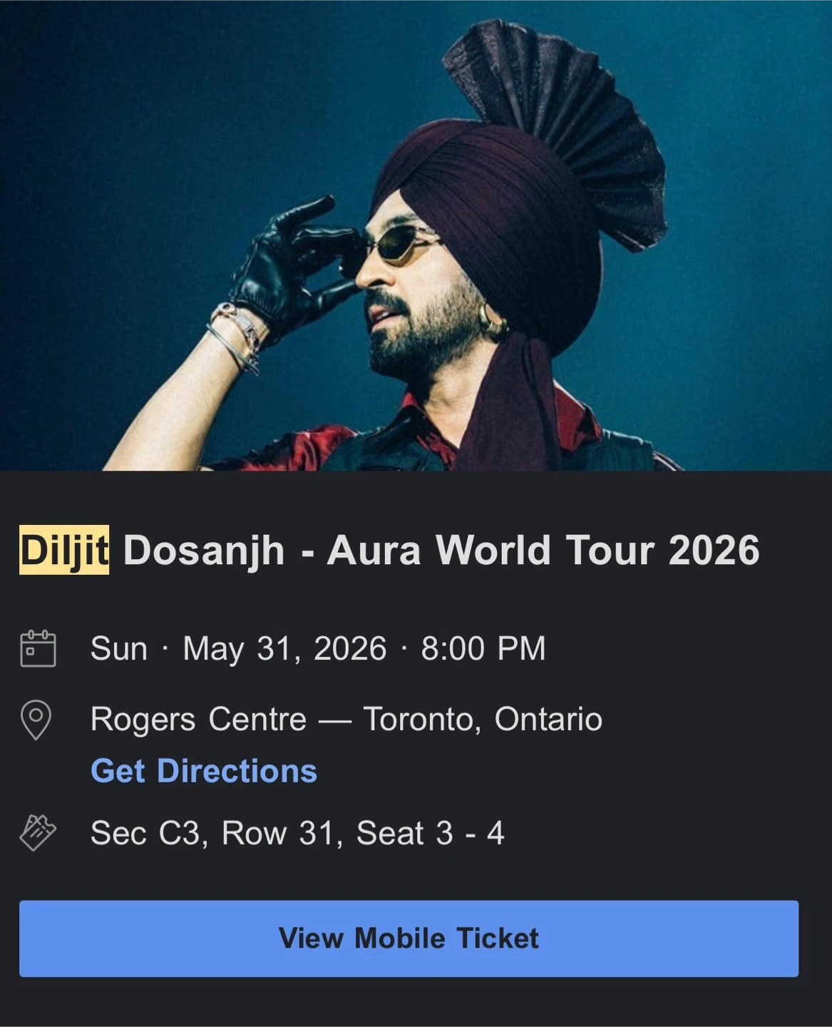 Two tickets for Diljit Dosanjh's Aura World Tour in Toronto. Section C3, Row 31, Seats 3-4. The concert is on Sunday, May 31, 2026, at 8:00 PM at the Rogers Centre. Great seats for a memorable night!