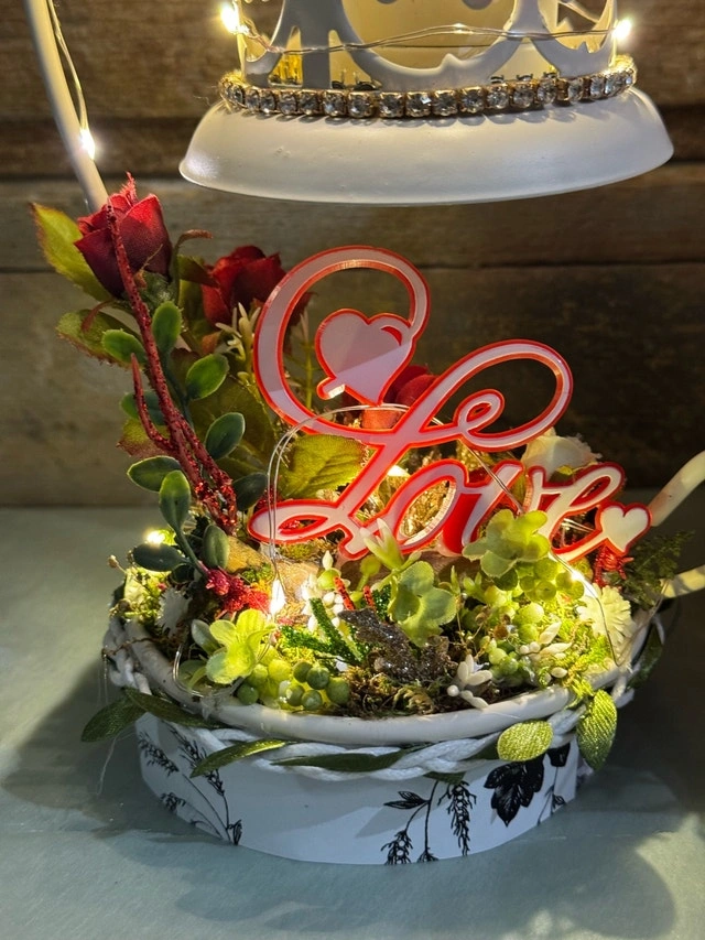 This lovely, one of a kind, unique ring holder features a charming lantern design, perfect for adding a touch of romance to your space. The stand is adorned with delicate lights and the base includes a floral accent with a 'Love' embellishment. The lantern is for showcasing an engagement ring or a ring that says “I Love You“. I’ve used a prop ring for a visual. This would make a beautiful “I Love & Value you”gift! If the ad is up, it's available!