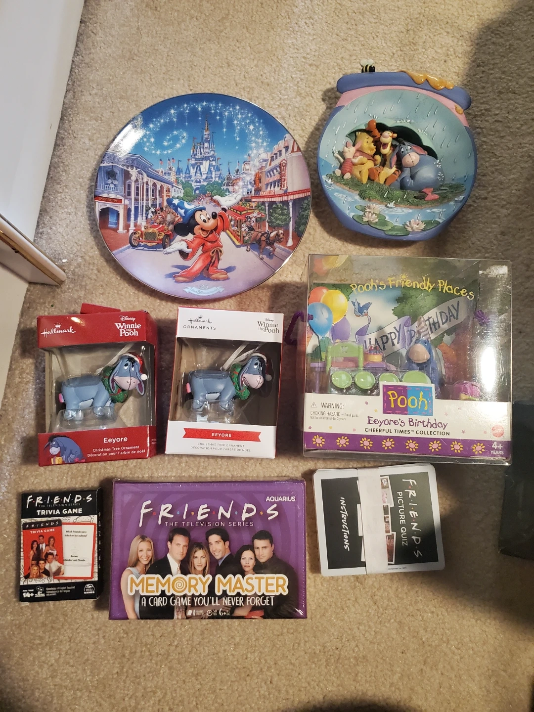Includes two Hallmark Winnie the Pooh Eeyore Christmas tree ornaments. Also features a Pooh's Friendly Places Eeyore's Birthday Cheerful Times Collection, and two Friends TV Series games: Trivia Game and Memory Master A Card Game You'll Never Forget. These are great for collectors or fans of Disney and Friends!