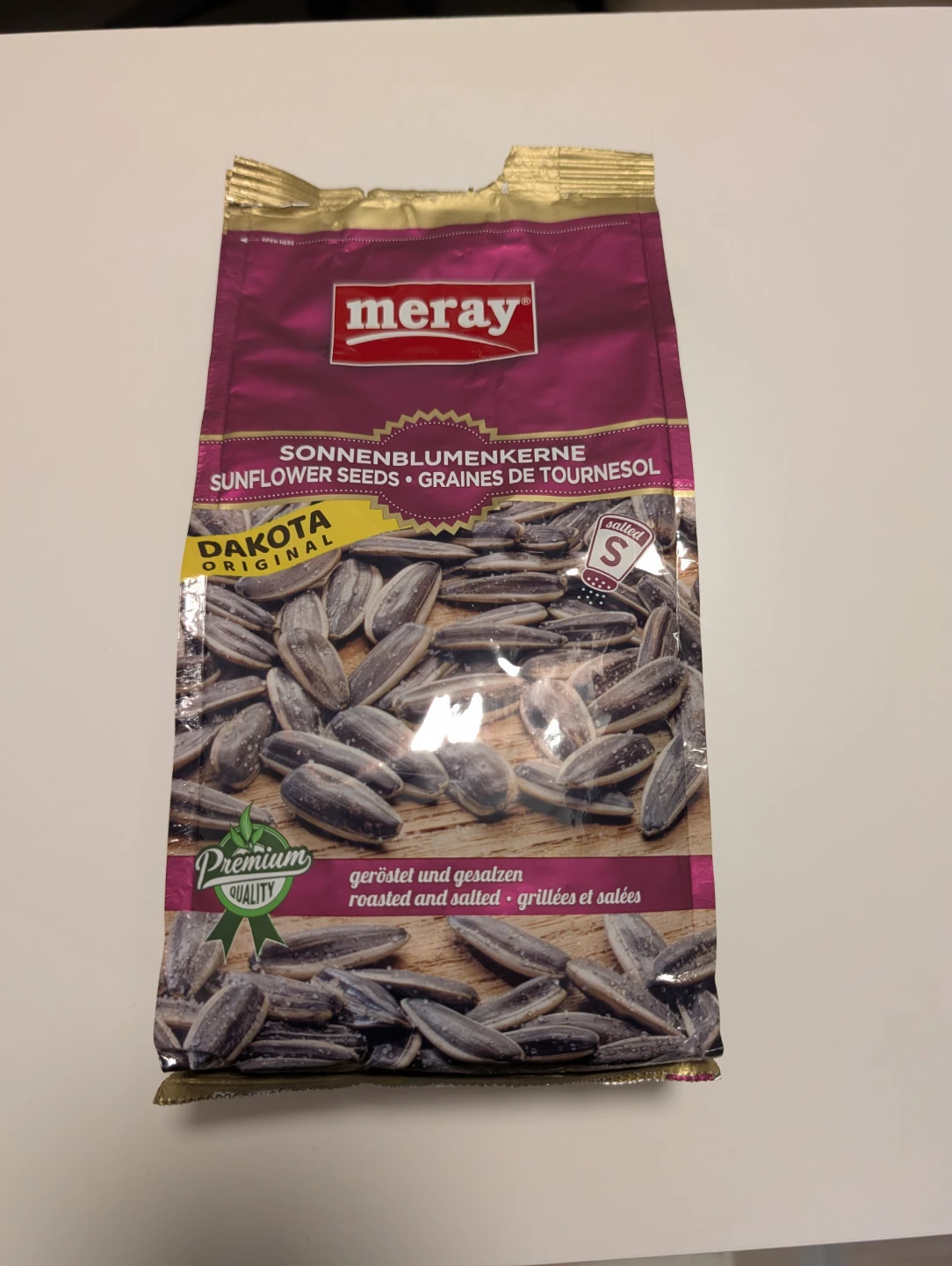 Meray sunflower seeds, Dakota Original flavour. Roasted and salted. Comes in a 250g bag. Expiration date is July 5, 2026.