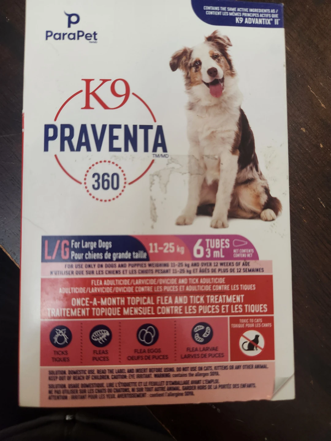 Traitement topique mensuel contre les puces et les tiques pour grands chiens pesant 11-25 kg. Contient 6 tubes de 3 ml. À utiliser sur les chiens et chiots de plus de 12 semaines.