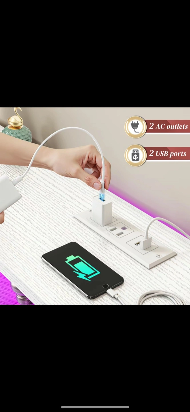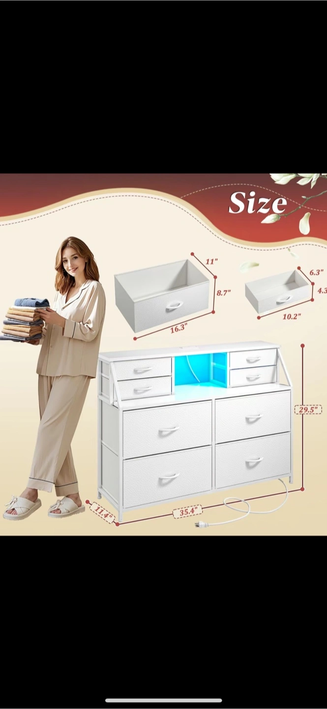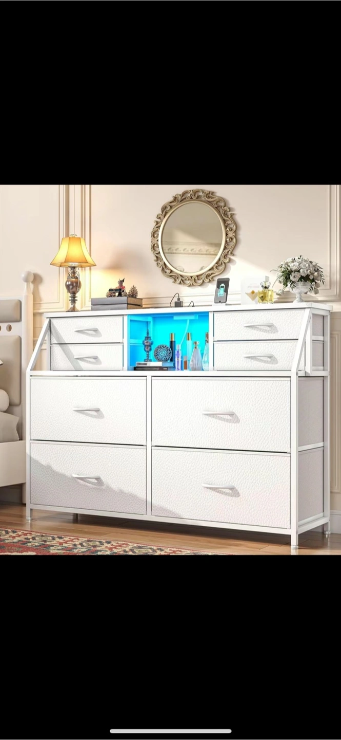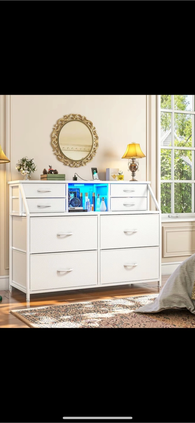 Just 65$. The orginal price is 199$. Brand new, assemble. Beautiful white dresser. Includes multiple drawers. A section with blue lights. Charging ports are included. The item is sure to help create a relaxing space.