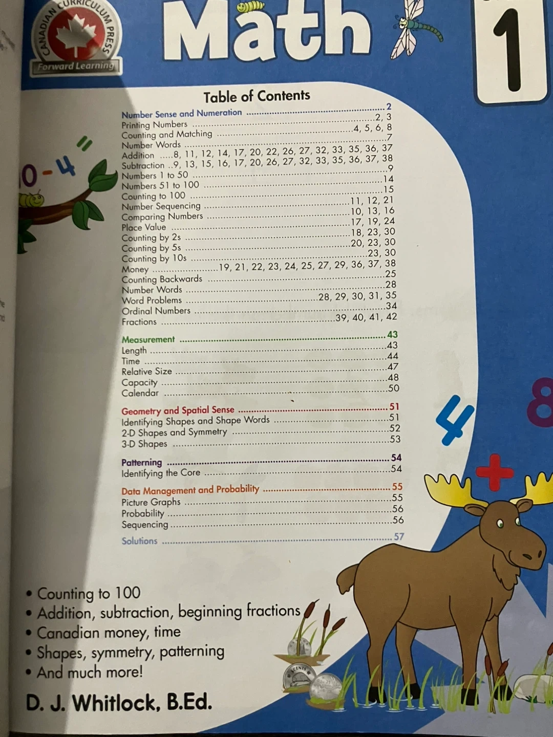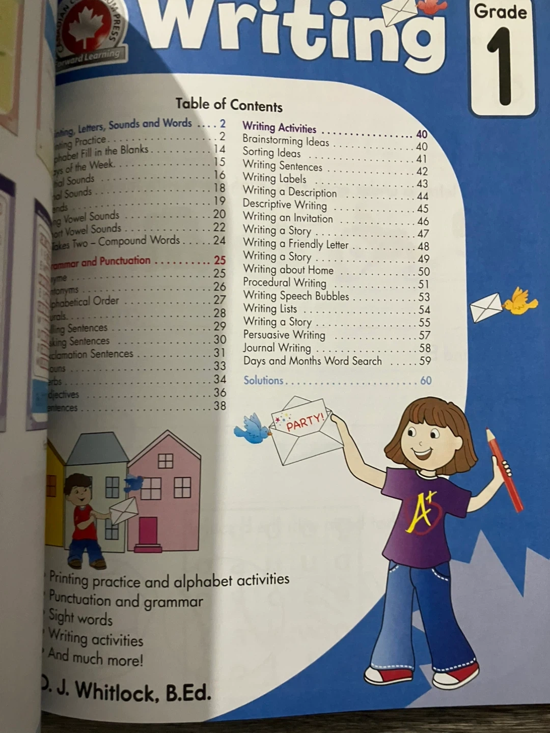 This book covers math, reading, and writing essentials for Grade 1. It includes sections on numeration, geometry, patterns, and time. Activities focus on printing, phonics, grammar, and creative writing.