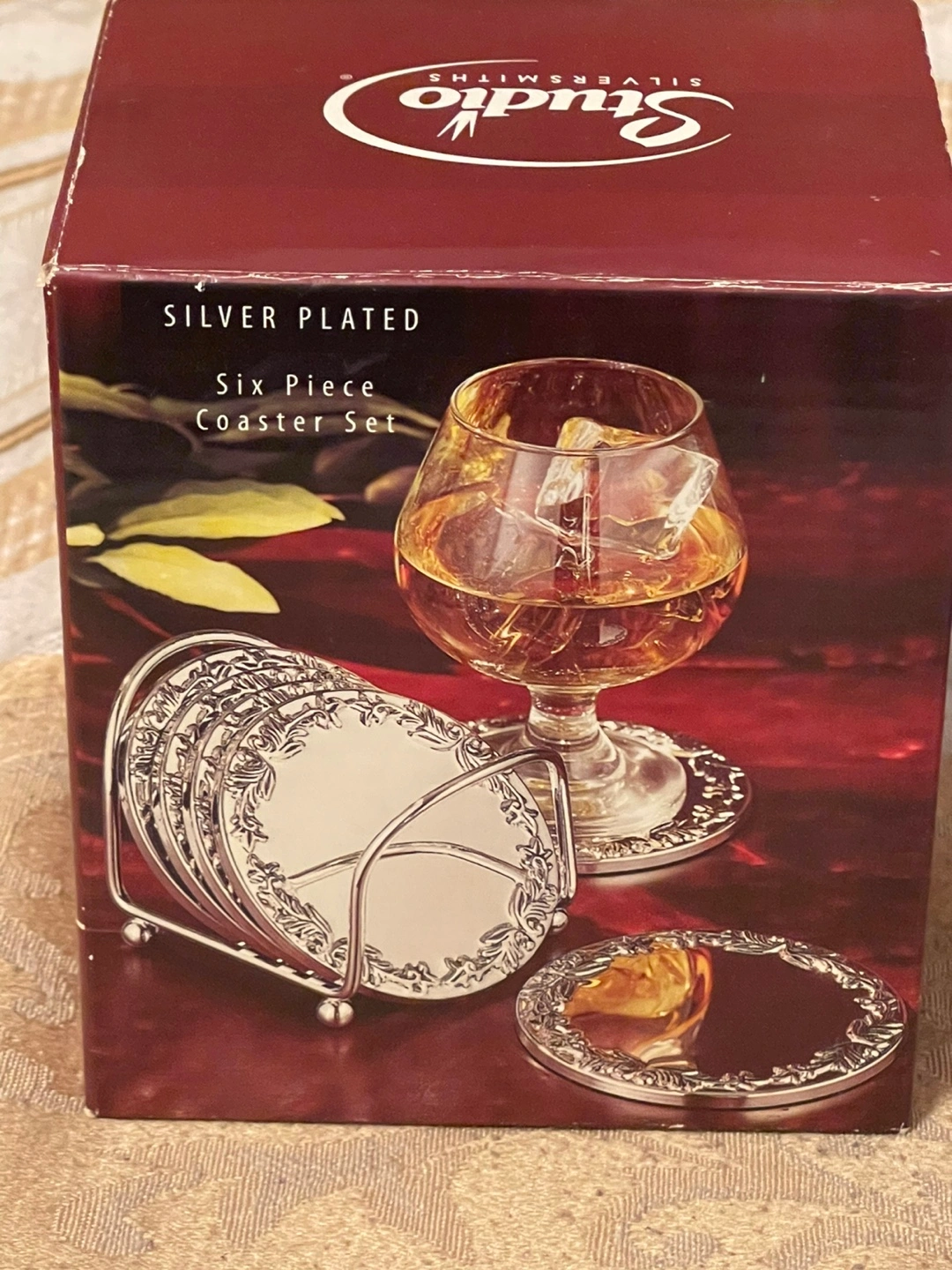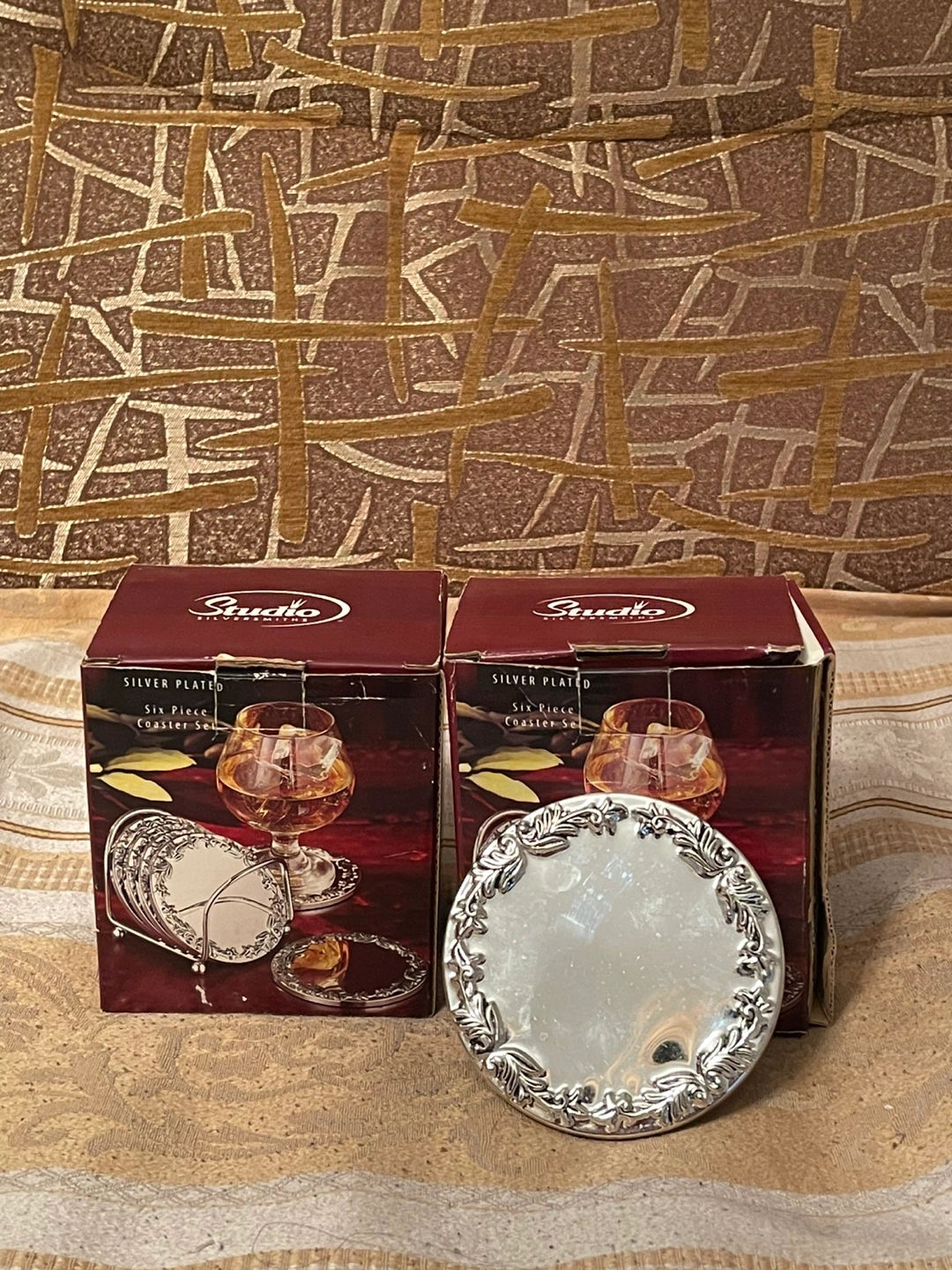 Six-piece coaster set. Silver plated. New in box. Elegant design. Perfect for entertaining. Price $16 negotiable for 2 boxes