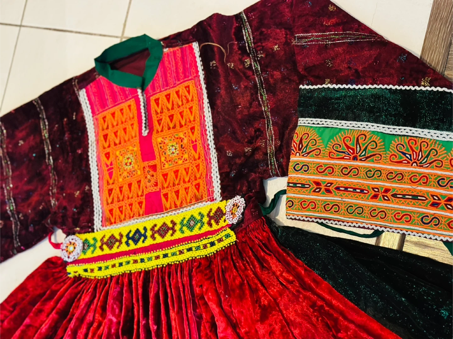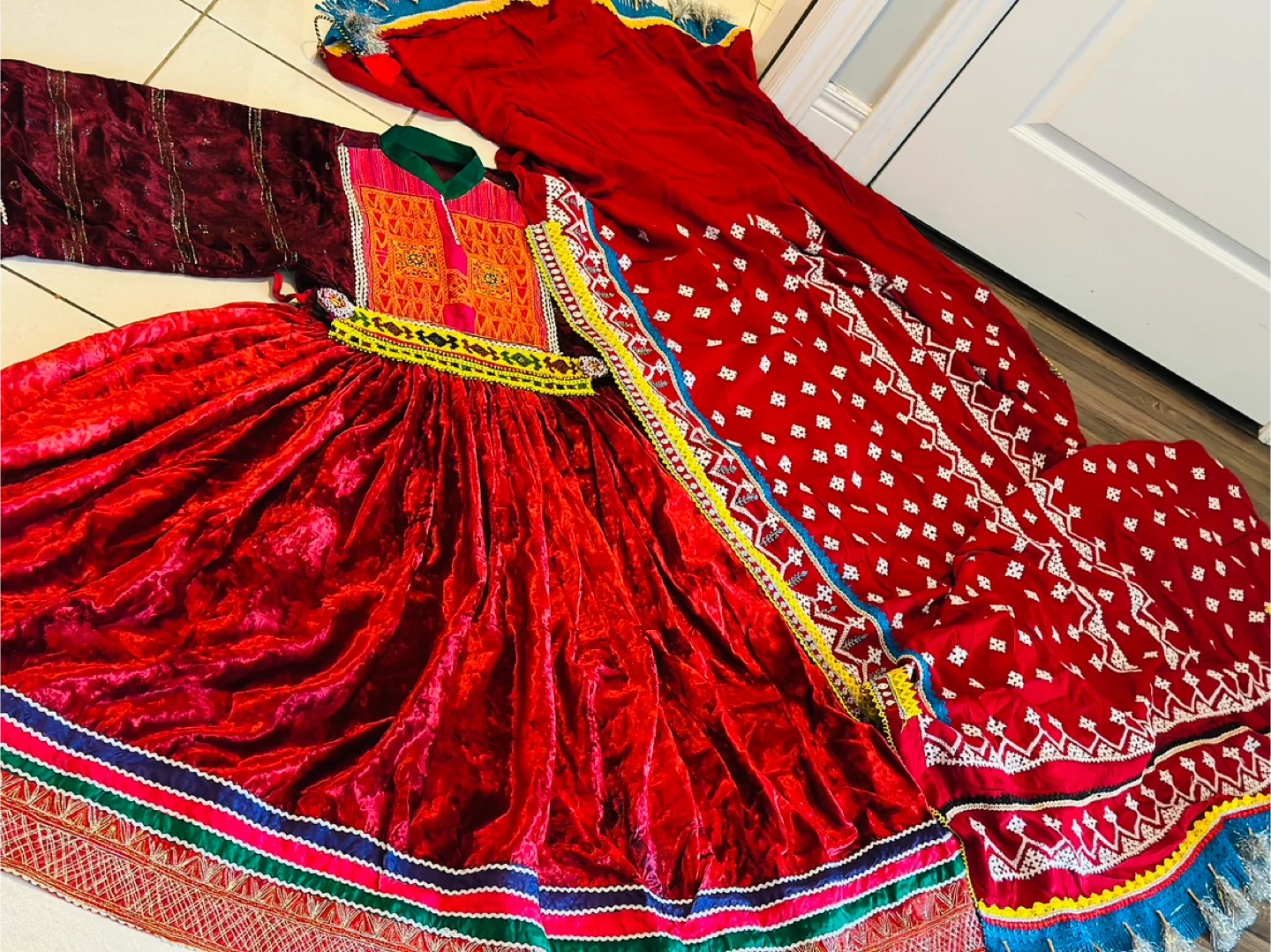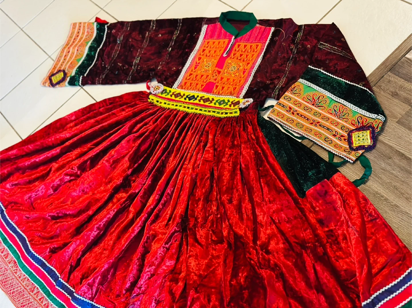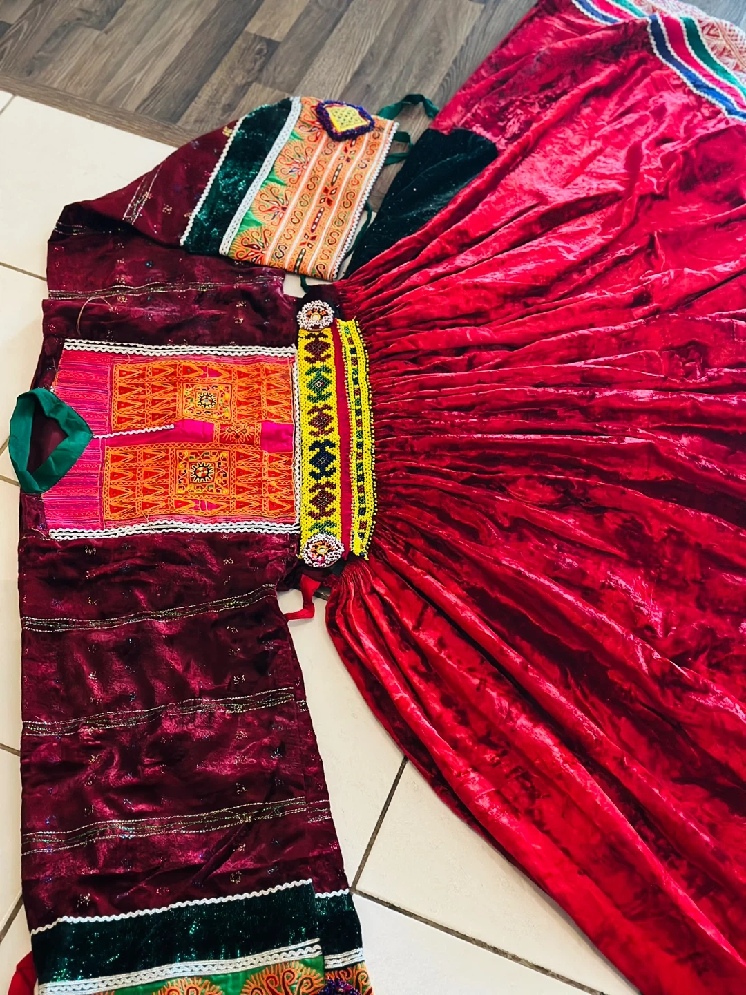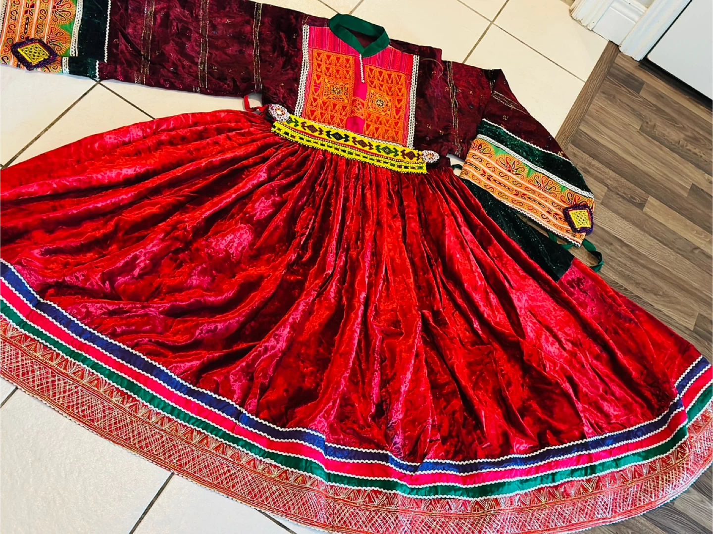 Beautiful traditional Afghan Kuchi dress, perfect for cultural events or celebrations! The dress features vibrant colours and intricate embroidery. It's made of velvet and has a full, flowing skirt. The set includes a matching top and headpiece. A unique and eye-catching piece!