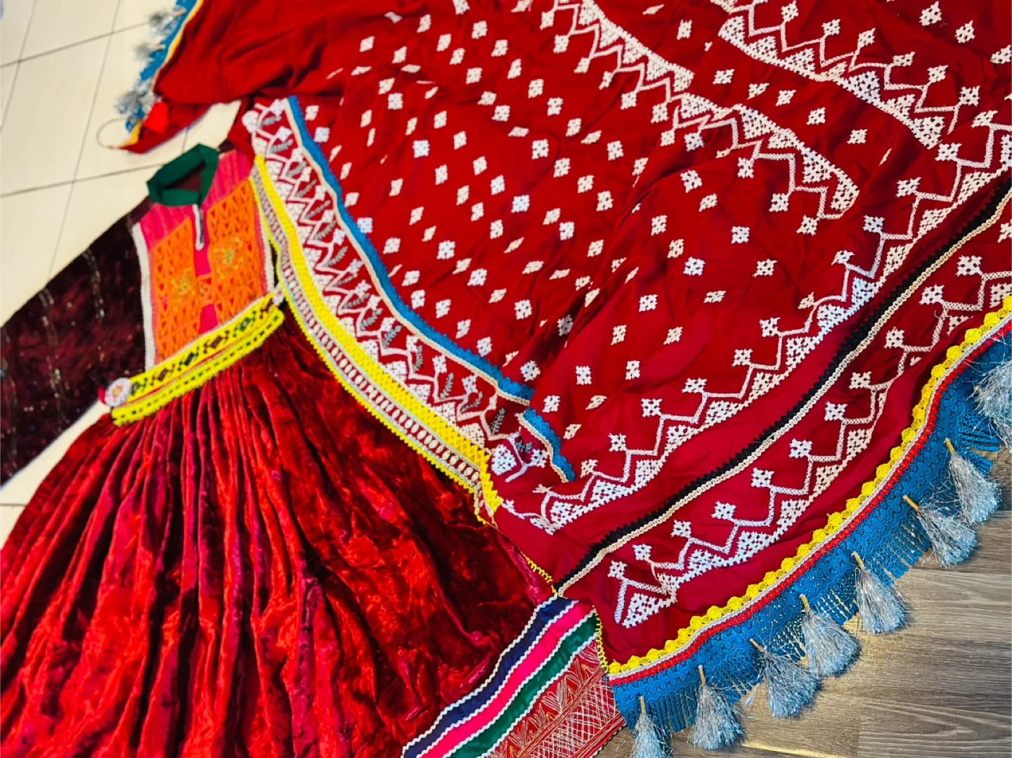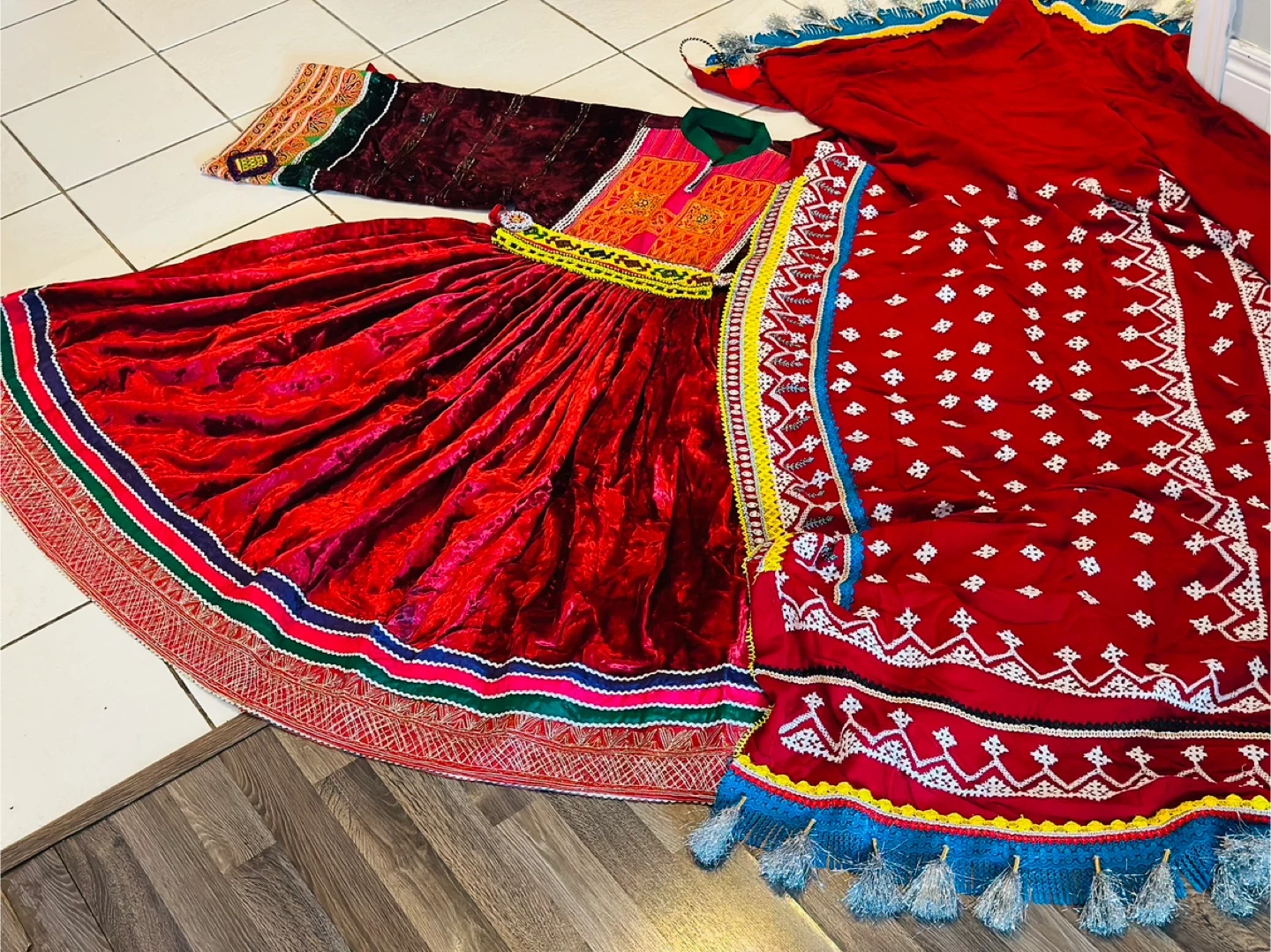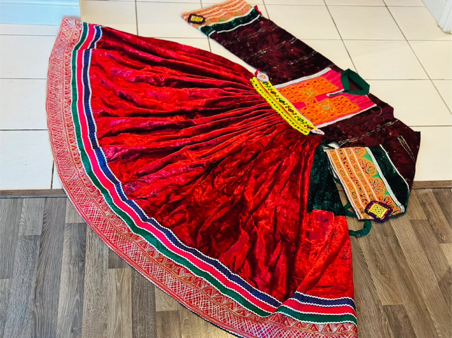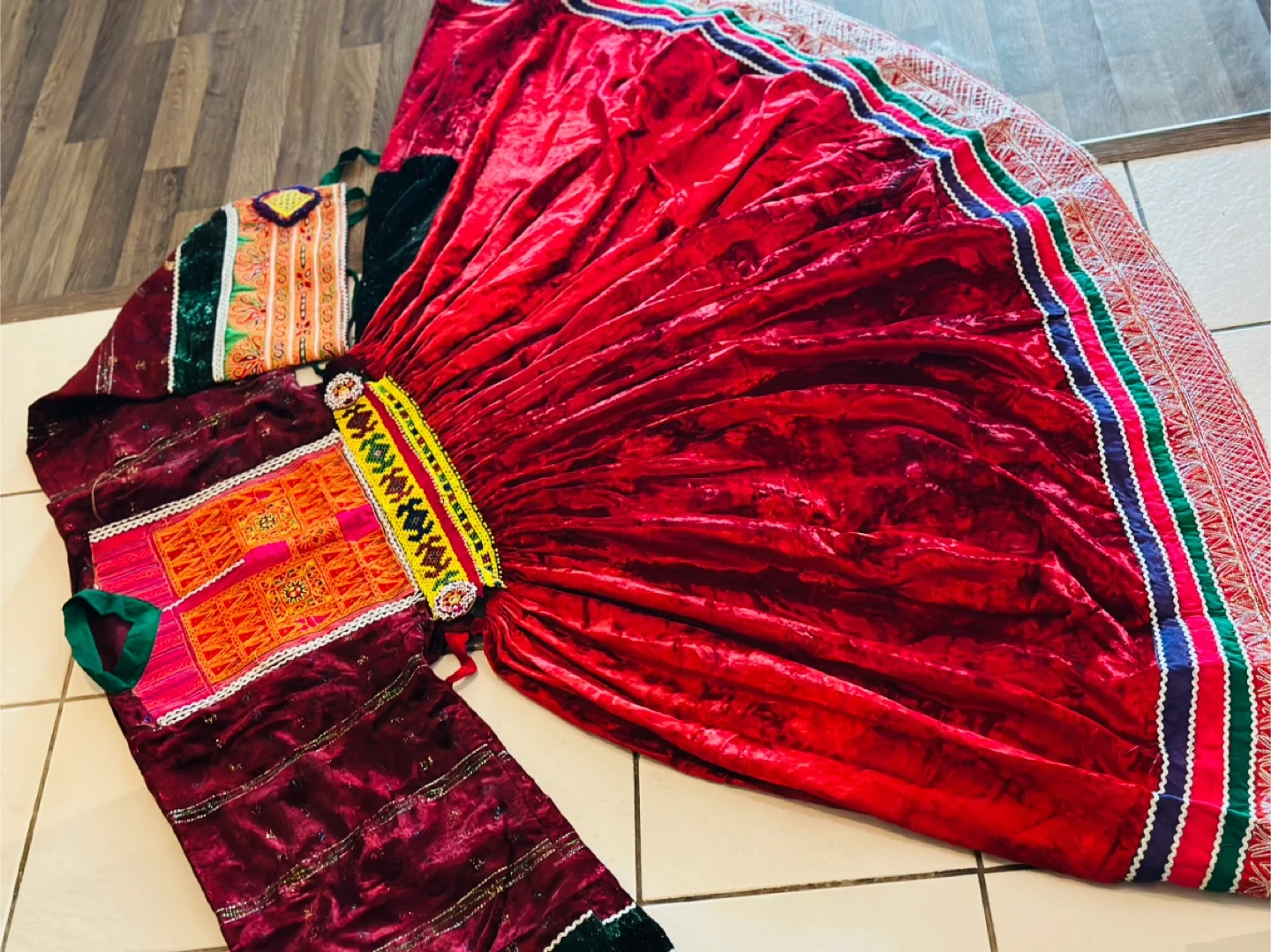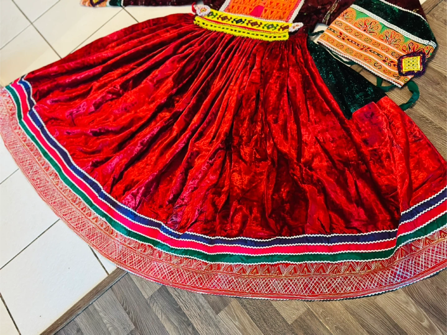 Beautiful traditional Afghan Kuchi dress, perfect for cultural events or celebrations! The dress features vibrant colours and intricate embroidery. It's made of velvet and has a full, flowing skirt. The set includes a matching top and headpiece. A unique and eye-catching piece!