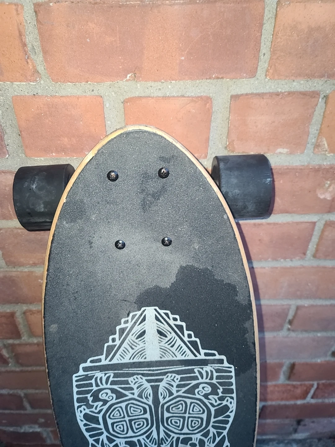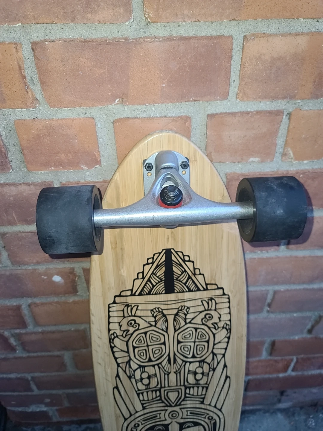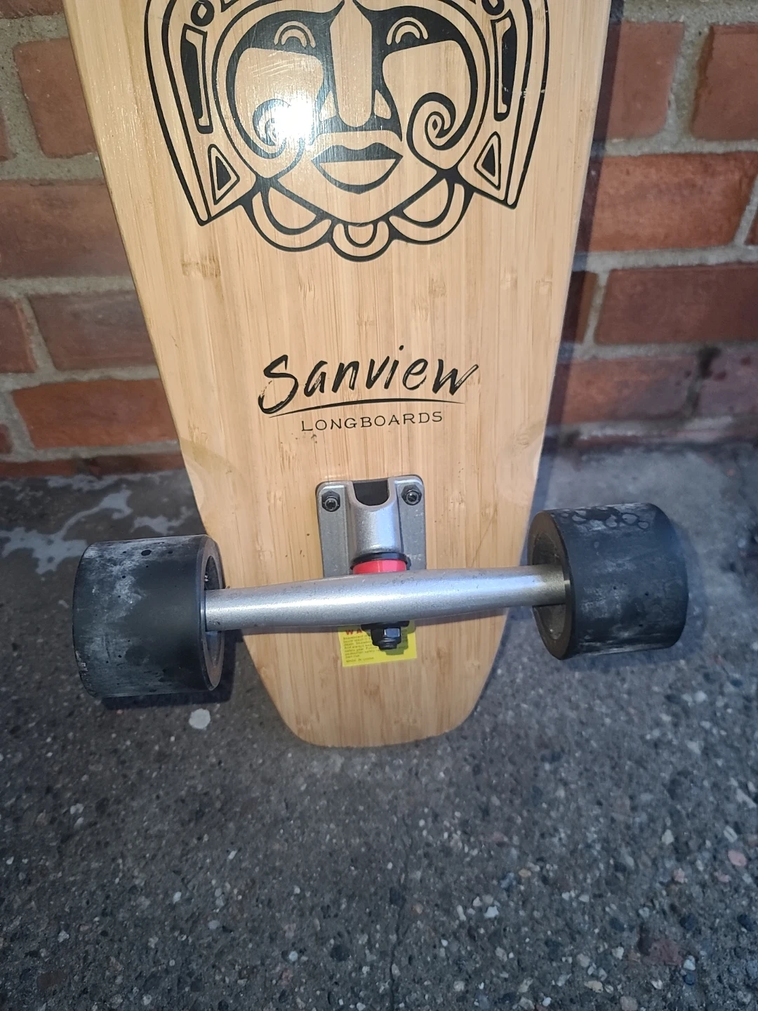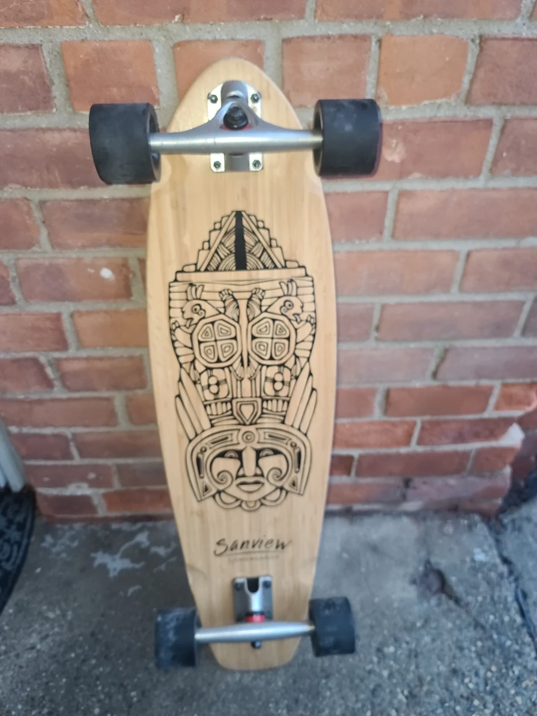 This Sanview longboard features a wooden deck with a cool tribal graphic. It has black wheels and silver trucks. Ready to ride!