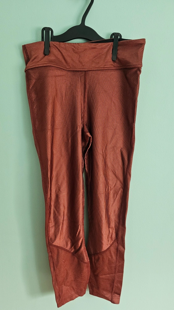 Washed but never worn. Leggings with a textured design and a wide waistband. They are an earthy, rusty colour. These leggings can provide you with comfortable support as you move.