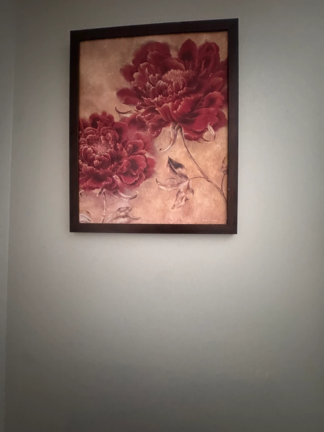 Framed print featuring two large red peonies against a textured, warm background. The dark brown frame complements the floral artwork. It's ready to hang on your wall! Perfect for adding a touch of nature to any room.