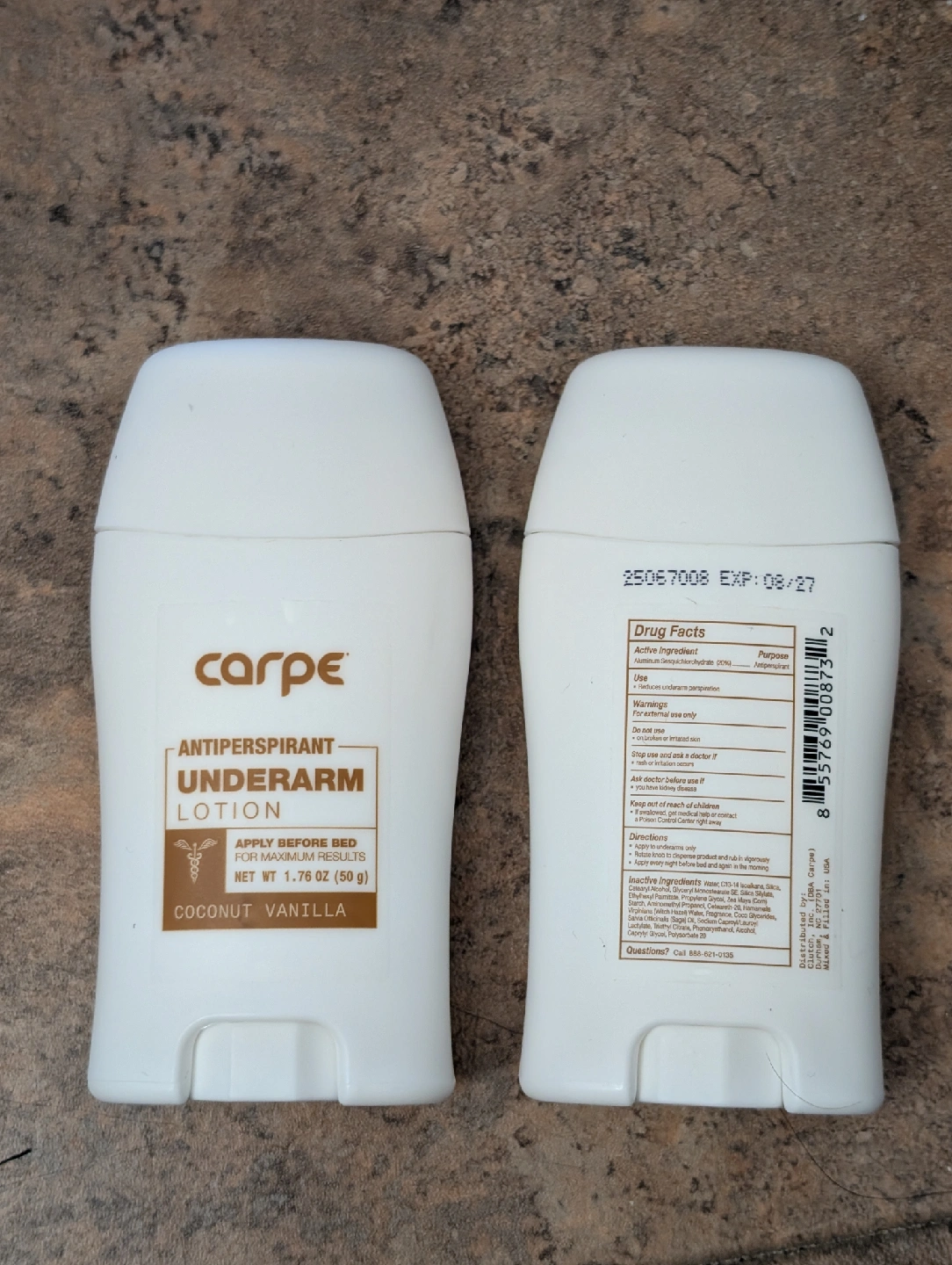 I'm selling Carpe Antiperspirant Underarm Lotion in Coconut Vanilla scent! It's an antiperspirant lotion designed to be applied before bed for maximum results. Net weight is 1.76 oz (50 g). Expiration date is August 2027